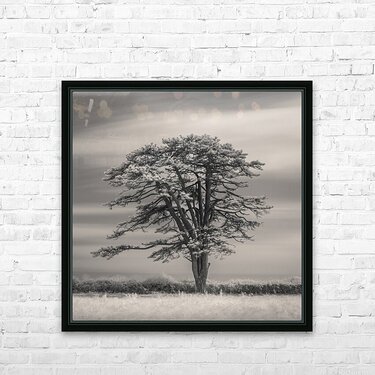 A monochrome, infrared, long exposure photograph of a majestic cedar tree at Llansteffan, Carmarthenshire, Wales. The infrared technique gives the tre...[+]