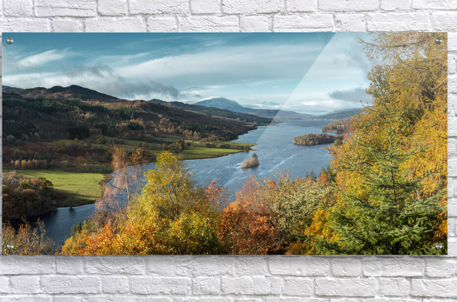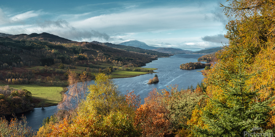 A panoramic photograph of Loch Tummel captured from Queen's View during autumn in Scotland, showcasing the vibrant fall foliage and the serene lak...[+]