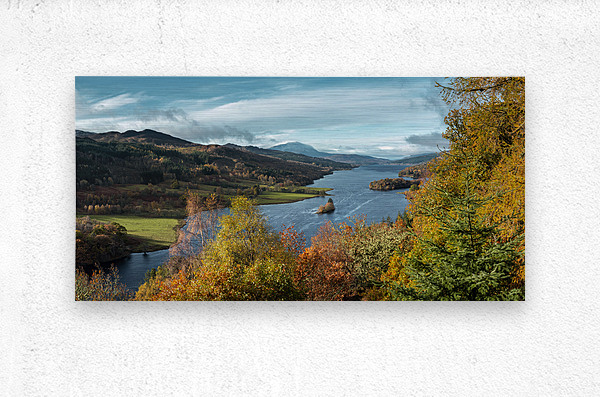 A panoramic photograph of Loch Tummel captured from Queen's View during autumn in Scotland, showcasing the vibrant fall foliage and the serene lake nestled in the rolling hills. This image highlights the rich colors of the season and the expansive natural landscape, providing a detailed and immersive view of this iconic Scottish location. The ideal photograph for those seeking a picturesque and authentic representation of Scotland's autumnal beauty.