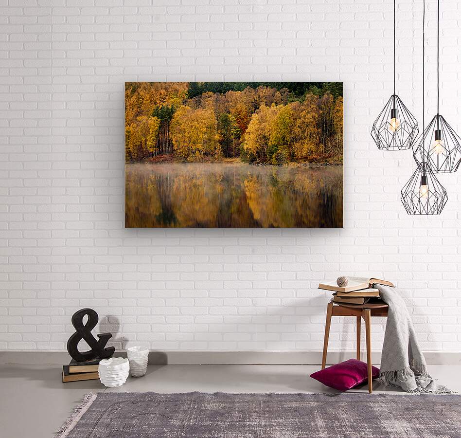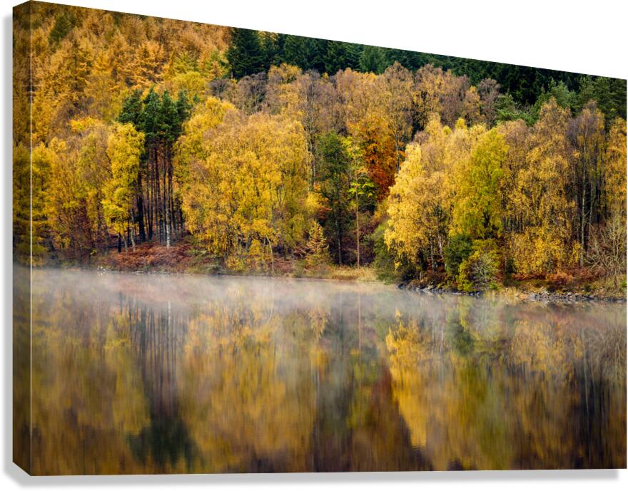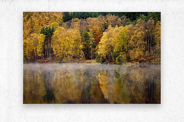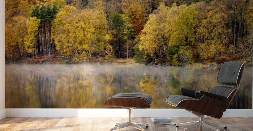 A serene autumn scene featuring trees with vibrant fall foliage reflected in the tranquil early morning waters of the River Tummel in Perth and Kinross, Scotland. The stillness of the river is accentuated by a delicate layer of mist hovering over the surface, adding an ethereal quality to the landscape. This photograph captures the calm and beauty of a crisp autumn morning in the Scottish Highlands. A perfect photograph for nature enthusiasts and landscape art collectors.