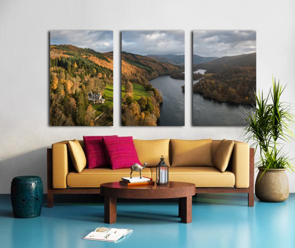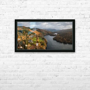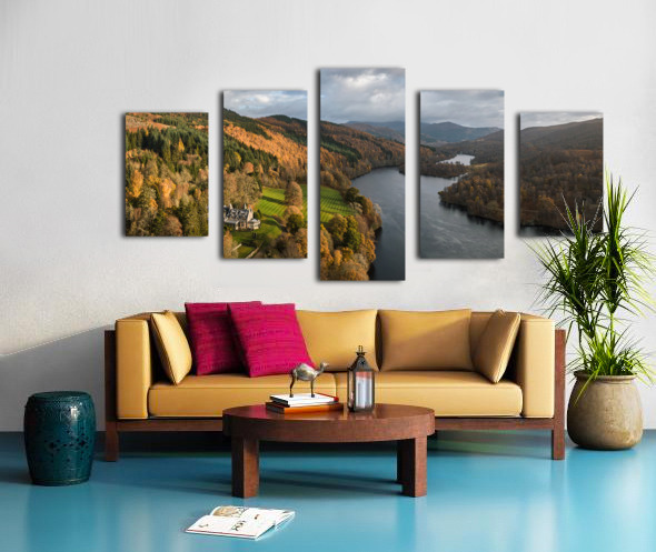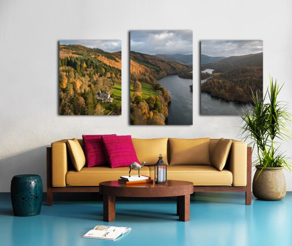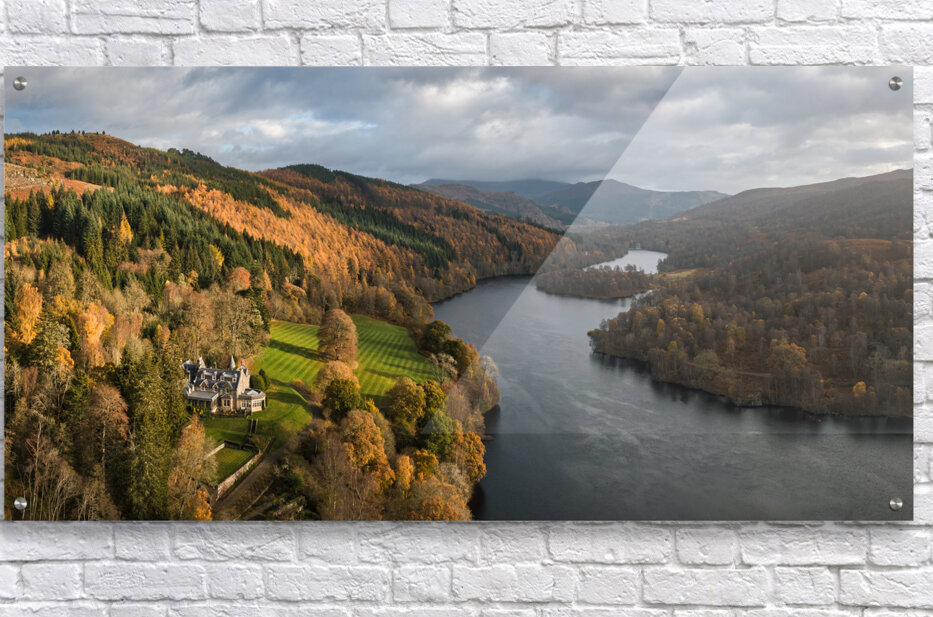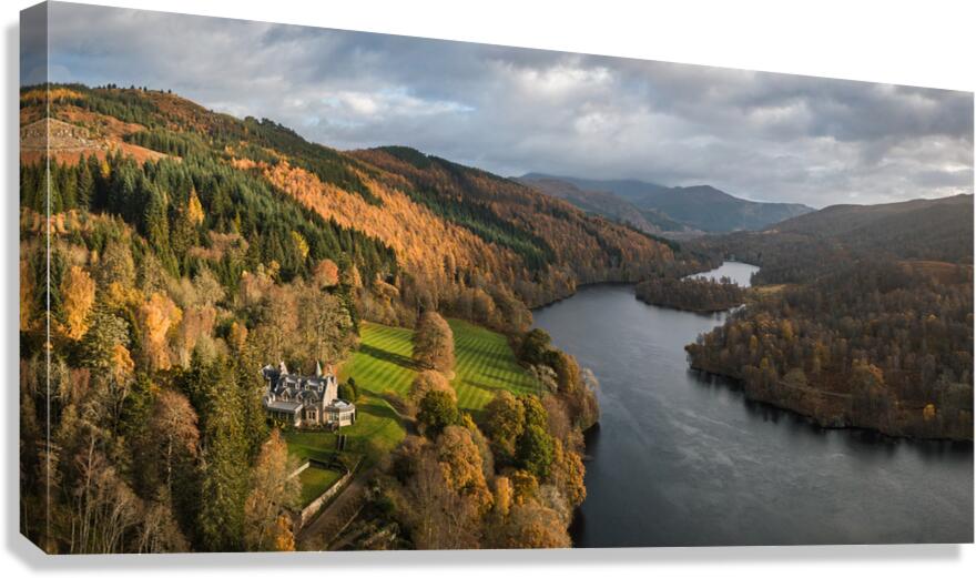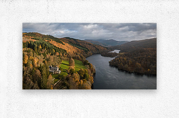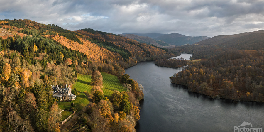 An aerial, panoramic view of Loch Tummel, showcasing the picturesque landscape extending towards Pitlochry on an autumn day in Perthshire, Scotland. This photograph features a grand country house nestled on the riverbanks, surrounded by the vibrant fall foliage of the Scottish Highlands. The image captures the serene beauty of the loch and the elegance of the stately home in its natural setting. A great photograph for those interested in Scottish landscapes and historic architecture.