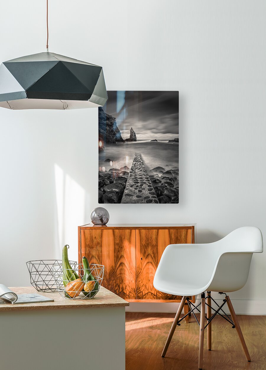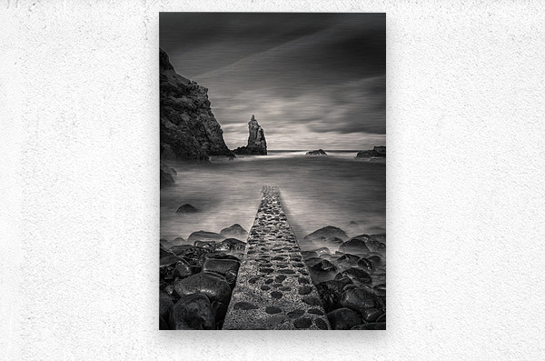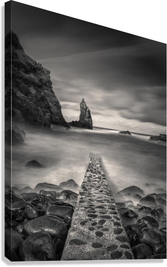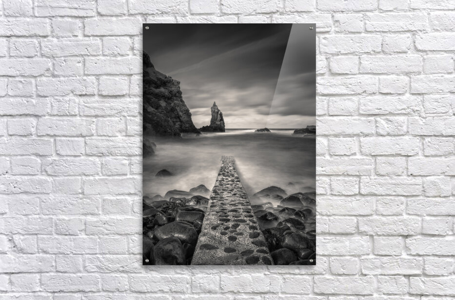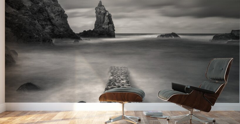 A monochrome, long exposure photograph capturing the view of the Irish Sea from Portcoon Jetty on the County Antrim coast, Northern Ireland. The stone jetty extends into the foreground, while a sea stack rises prominently in the distance. A perfect photograph for coastal enthusiasts, interior decorators, or anyone seeking serene and dramatic seascape art with a timeless aesthetic.