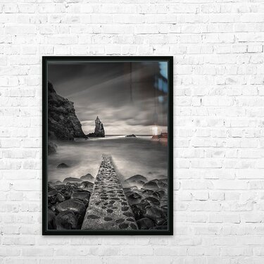 A monochrome, long exposure photograph capturing the view of the Irish Sea from Portcoon Jetty on the County Antrim coast, Northern Ireland. The stone...[+]