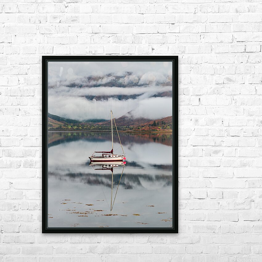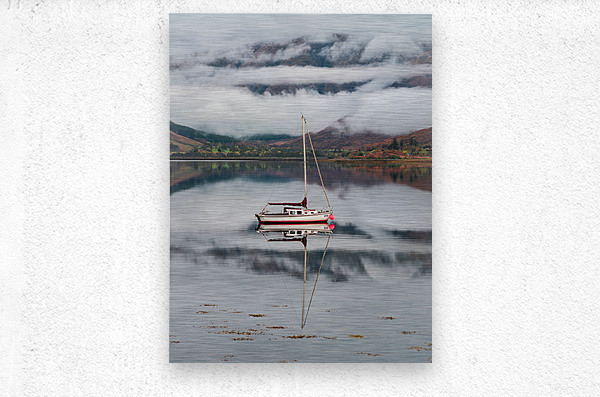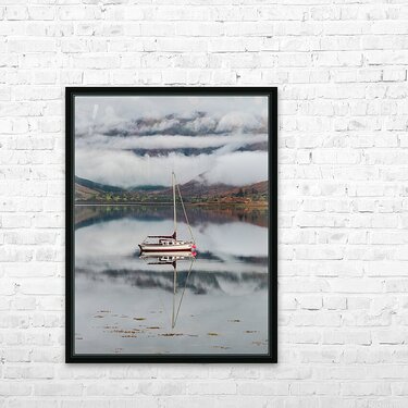 A moored sailing boat reflected in the calm waters of Loch Duich in Glen Shiel, surrounded by the rugged Scottish Highlands. The autumn scene is set with low clouds and early morning mist gently covering the distant mountains, creating a serene and atmospheric landscape. A great photograph for those seeking Scottish landscapes, nature enthusiasts, or anyone looking to add a touch of the Highlands' tranquility to their space.
