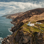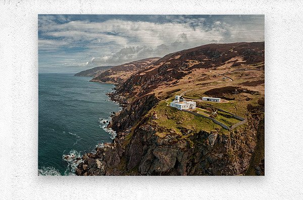 An aerial view of the Mull of Kintyre Lighthouse, positioned at the southwesternmost tip of the Kintyre Peninsula, Scotland. This photograph captures the historic lighthouse amidst dramatic cliffs and rugged coastlines, with the vast expanse of the Atlantic Ocean stretching into the distance. The contrast between the rocky shores and the open sea highlights the remote and scenic beauty of this iconic Scottish location. A great photograph for landscape enthusiasts, collectors of Scottish coastal imagery, or those seeking distinctive aerial perspectives of Scotland’s landmarks.