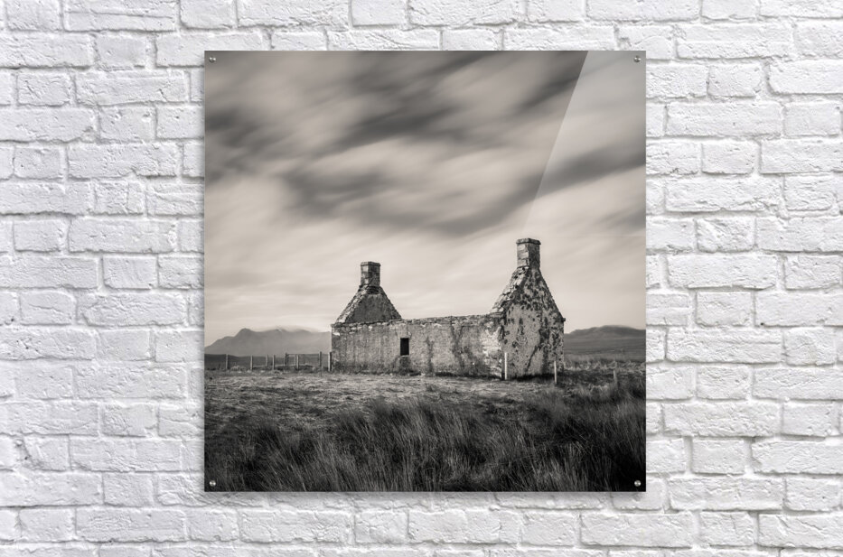 A long exposure monochrome photograph of the derelict Moine House situated on the edge of the vast bogland known as Flow Country in the Scottish Highlands. The abandoned structure with its roofless frame stands as a stark reminder of the areas rugged history and remote beauty. A perfect photograph for those interested in historic architecture landscape photography or the atmospheric landscapes of Scotland.
