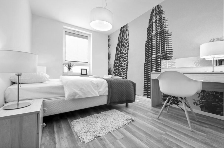 A monochrome infrared photograph of the Petronas Twin Towers in Kuala Lumpur Malaysia captured from between trees in KLCC Park. This unique perspective highlights the architectural details and contrasts of the iconic skyscrapers. The ideal photograph for enthusiasts of urban landscapes and architectural photography. ..... Please Note: This image has a slightly grainy texture to it which is part of the aesthetic