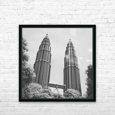 A monochrome infrared photograph of the Petronas Twin Towers in Kuala Lumpur Malaysia captured from between trees in KLCC Park. This unique perspectiv...[+]