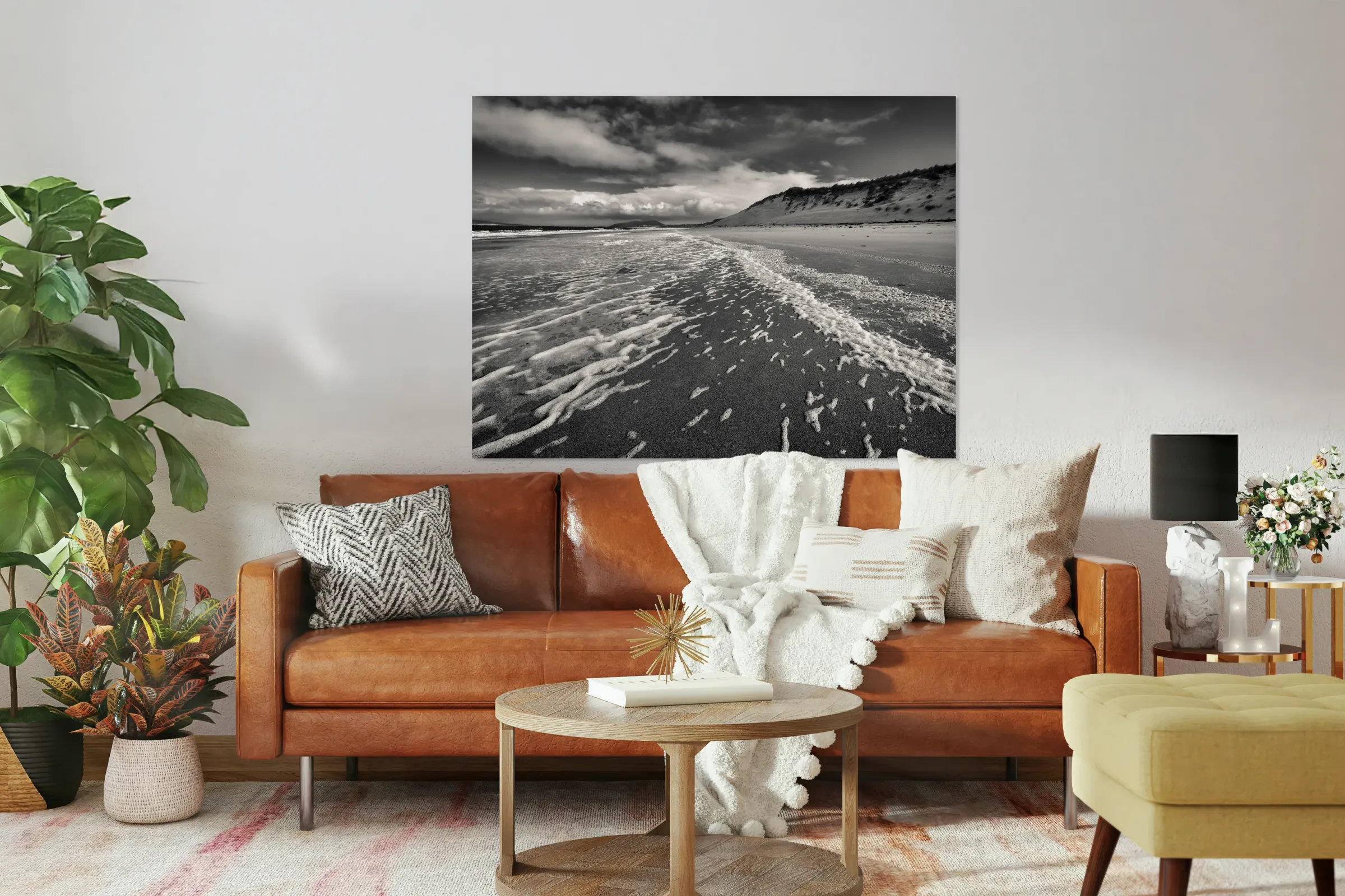 A monochrome photograph of the remote West Beach at Berneray North Uist in the Scottish Outer Hebrides. The image captures sea foam along the shoreline soft sand dunes and dynamic clouds drifting across the sky. A great photograph for landscape enthusiasts coastal decor or those looking to bring a touch of the Scottish wilderness into their space.