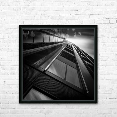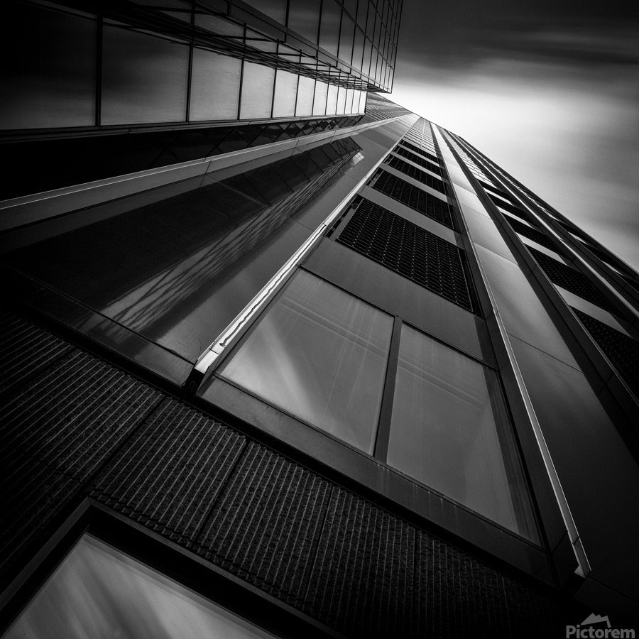 A monochrome long exposure photograph capturing the De Maastoren building in Rotterdam from a dramatic low angle. This semi-abstract image emphasizes ...[+]