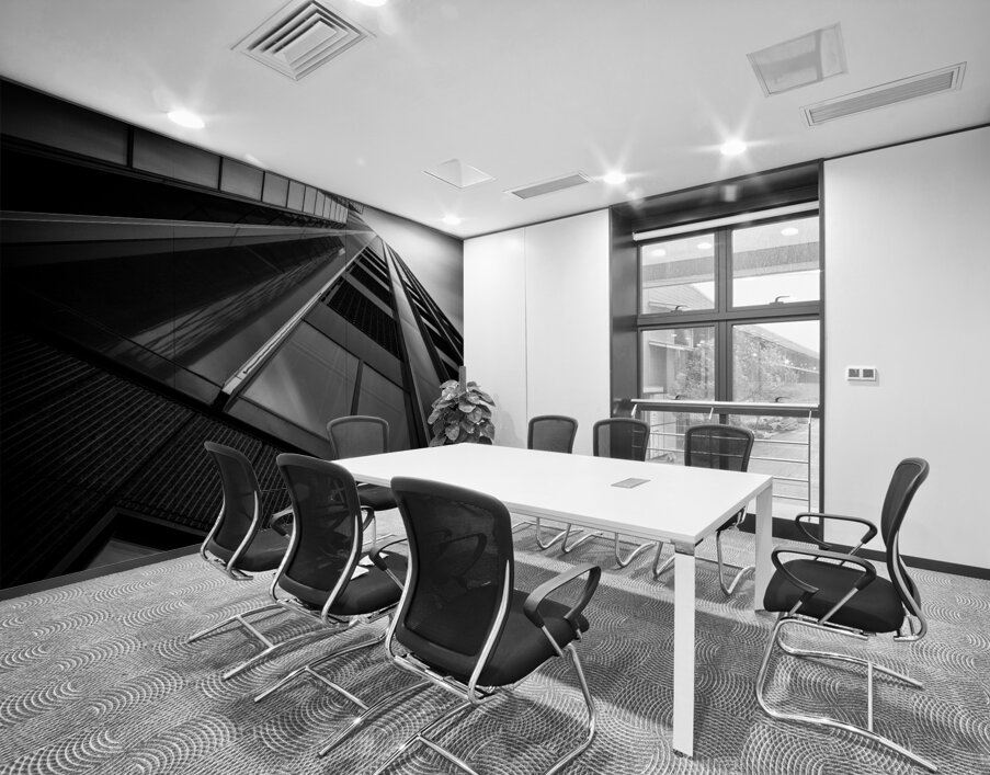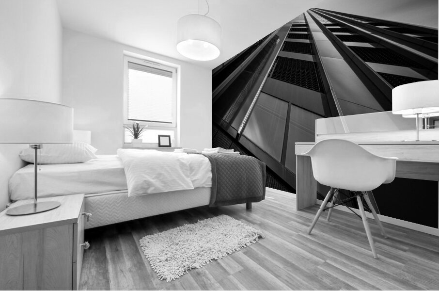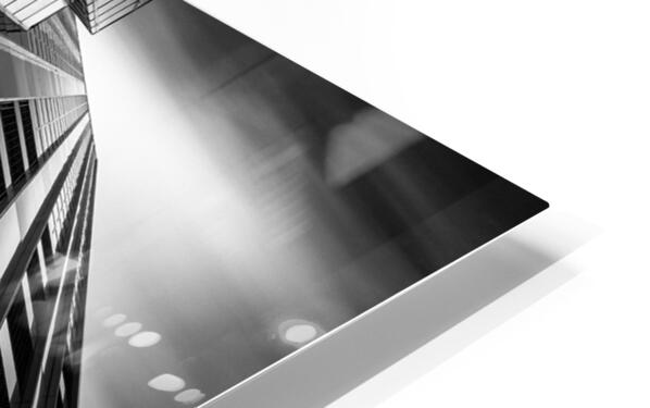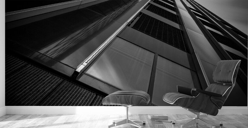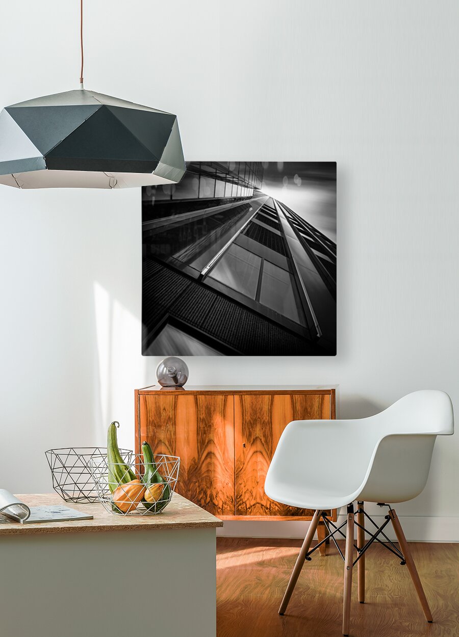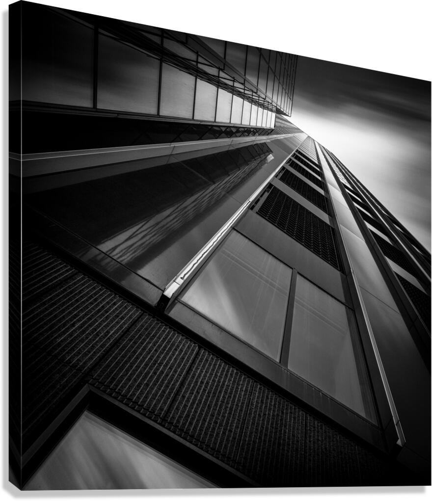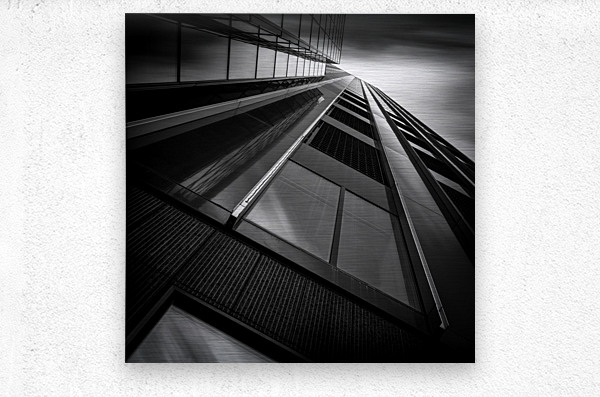 A monochrome long exposure photograph capturing the De Maastoren building in Rotterdam from a dramatic low angle. This semi-abstract image emphasizes geometric lines and architectural details offering a unique perspective of modern urban design. A perfect photograph for architecture enthusiasts interior designers or anyone seeking a striking piece of urban photography.