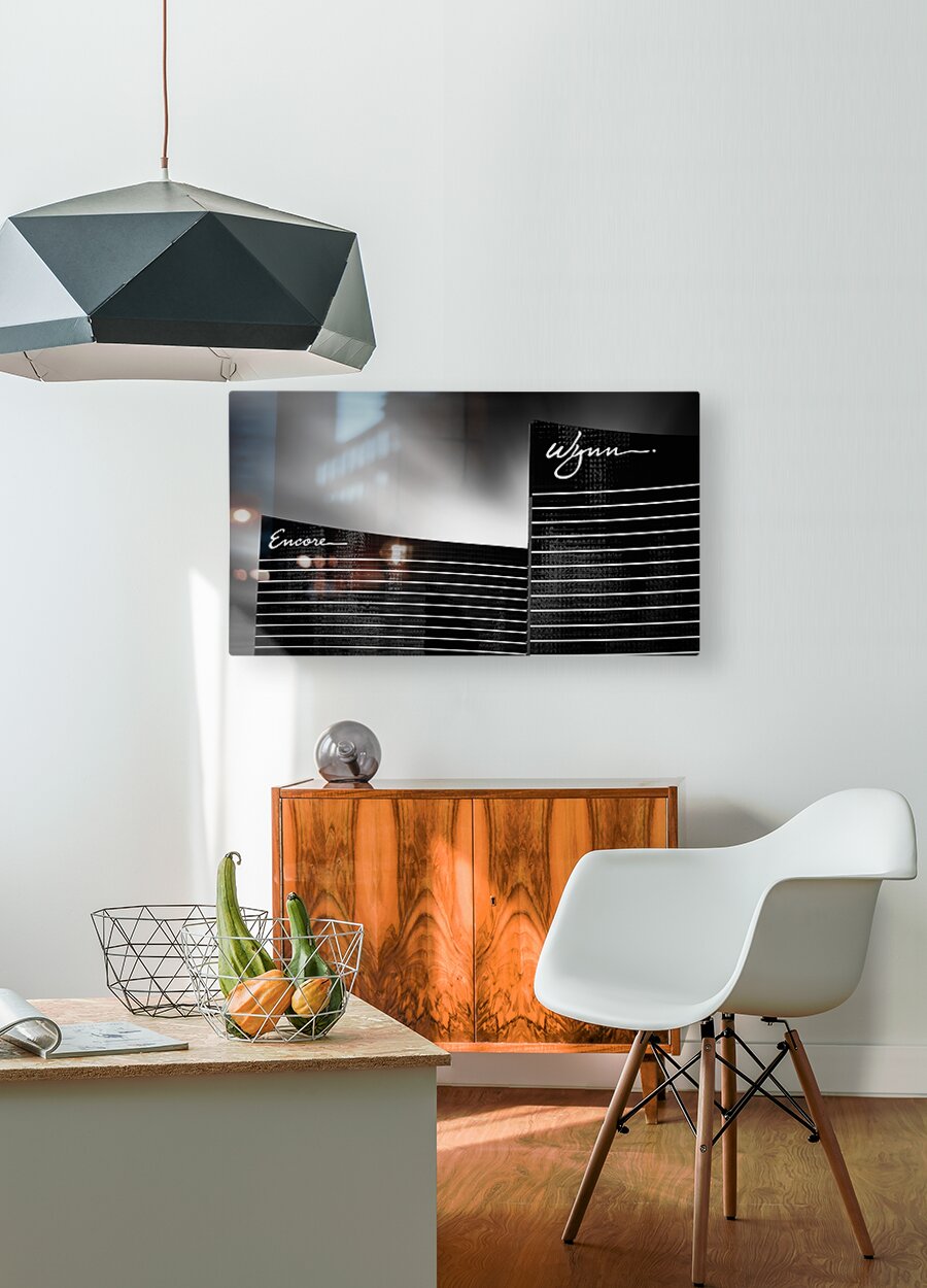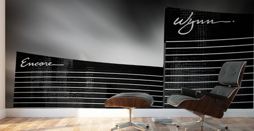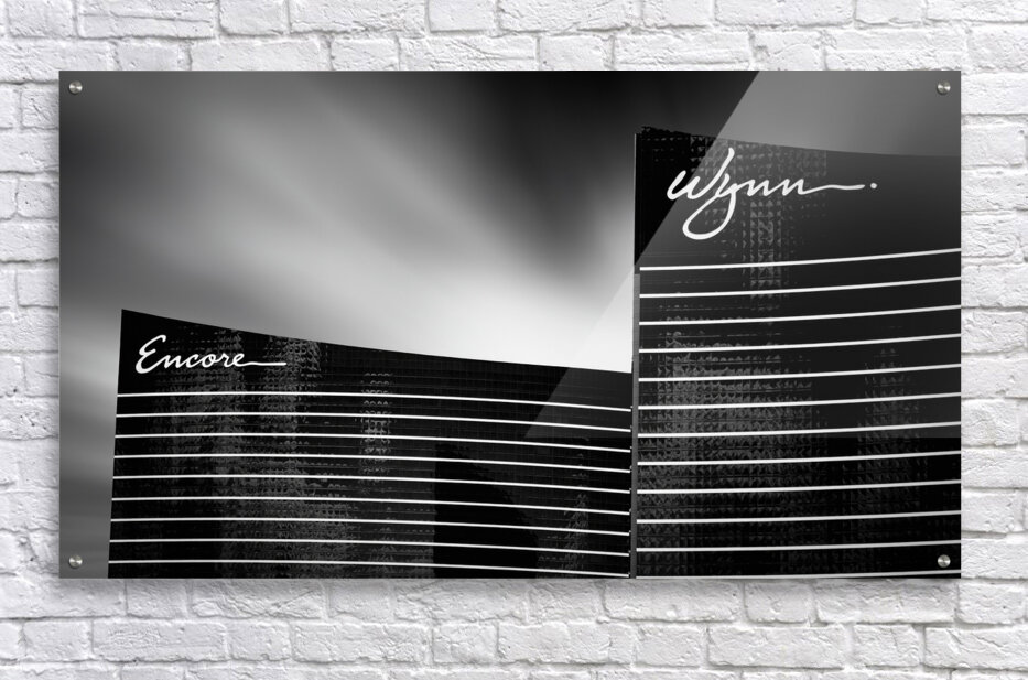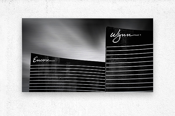 A monochrome fine art photograph featuring the iconic Encore and Wynn hotels in Las Vegas Nevada. This black and white image highlights the sleek architecture and unique design of these famous landmarks capturing the essence of the Las Vegas skyline. A great photograph for hotel decor architecture enthusiasts or anyone looking to add a touch of Las Vegas elegance to their space.