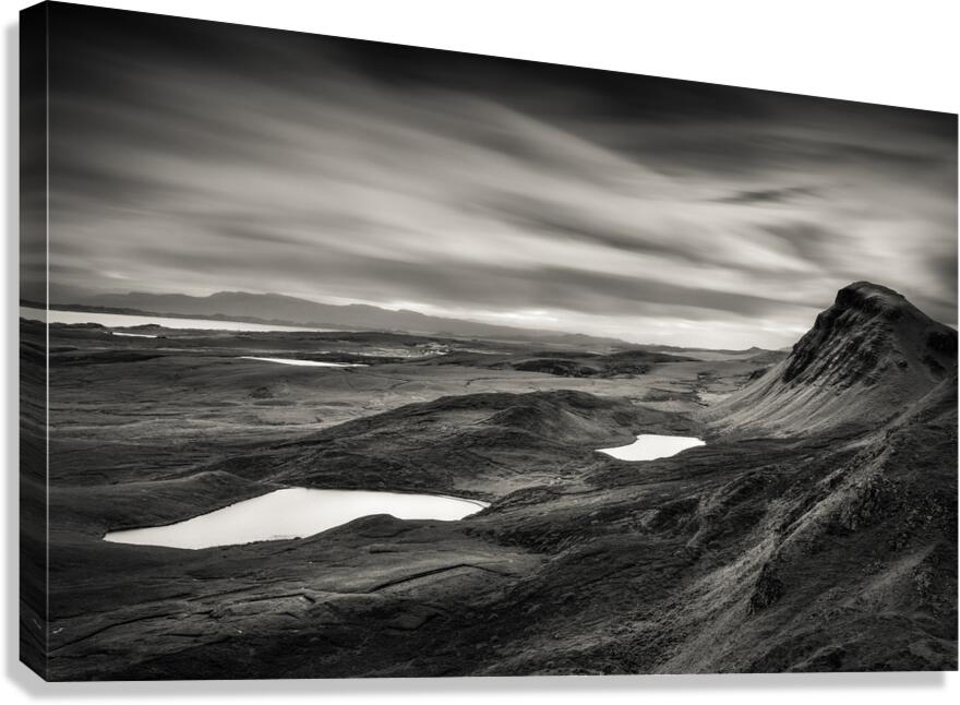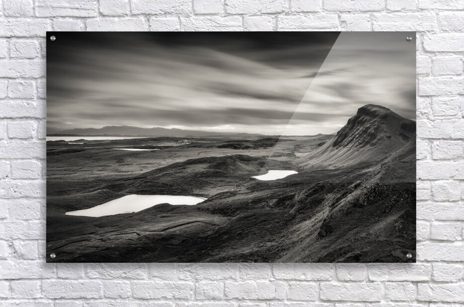 A dramatic monochrome landscape of the Quiraing valley on the Isle of Skye Scotland showcasing its rugged mountains and tranquil lakes in striking contrast. The interplay of light and shadow reveals the unique terrain of this iconic location. A perfect photograph for those seeking bold timeless imagery of the Scottish Highlands to enhance a minimalist or nature-inspired space.