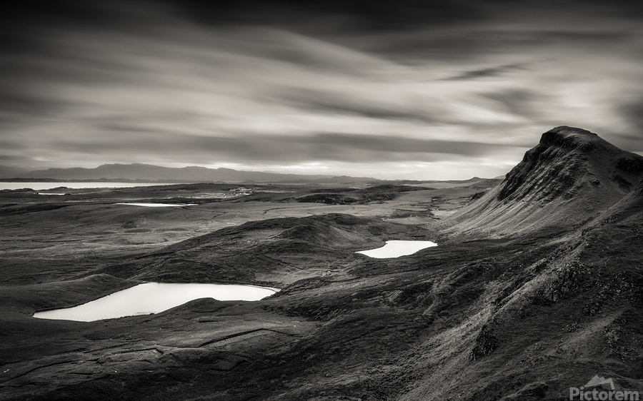 A dramatic monochrome landscape of the Quiraing valley on the Isle of Skye Scotland showcasing its rugged mountains and tranquil lakes in striking con...[+]
