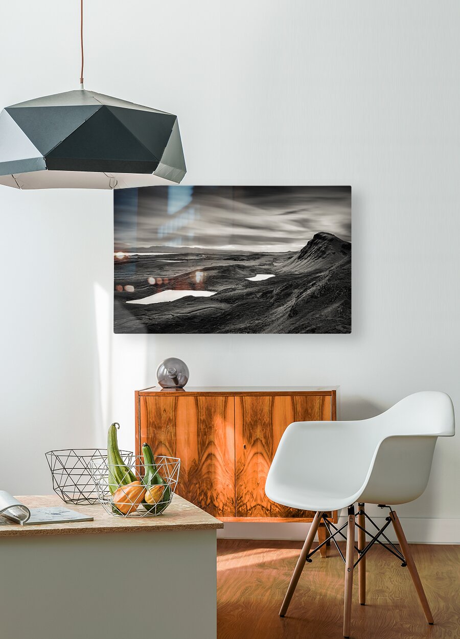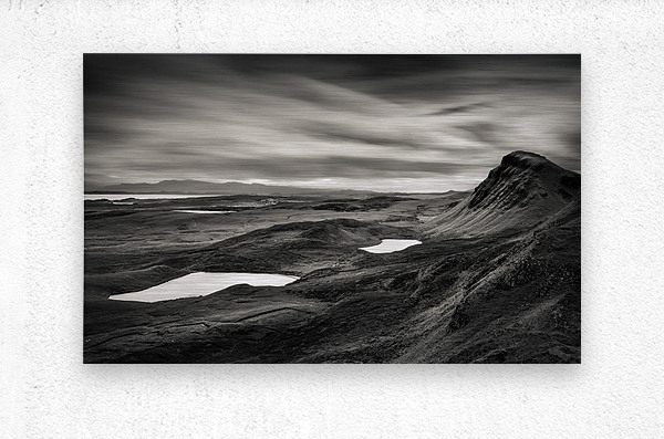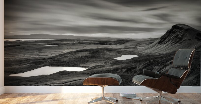 A dramatic monochrome landscape of the Quiraing valley on the Isle of Skye Scotland showcasing its rugged mountains and tranquil lakes in striking contrast. The interplay of light and shadow reveals the unique terrain of this iconic location. A perfect photograph for those seeking bold timeless imagery of the Scottish Highlands to enhance a minimalist or nature-inspired space.