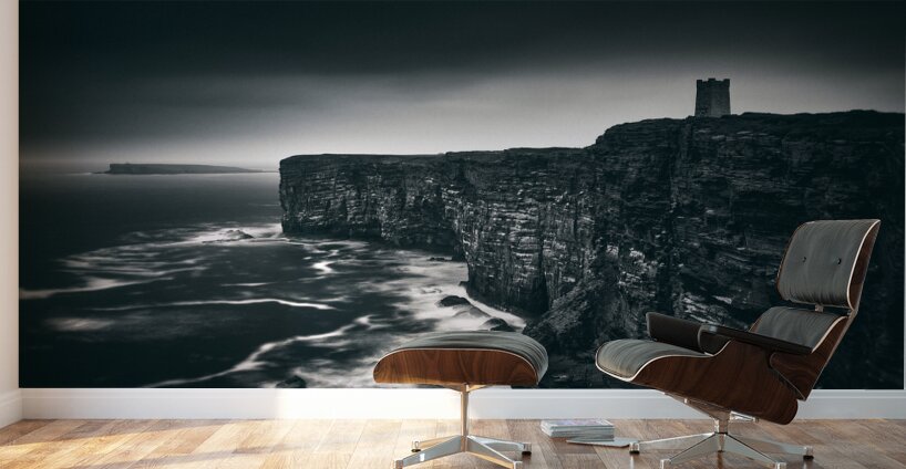 A monochrome panoramic view of the Kitchener Memorial at Marwick Head Orkney captured under stormy skies. The dramatic cliffs and rugged coastline add depth and atmosphere to this powerful landscape. The ideal photograph for lovers of historic landmarks coastal scenery and those seeking bold timeless wall art.