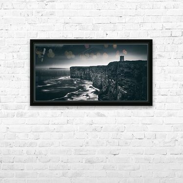 A monochrome panoramic view of the Kitchener Memorial at Marwick Head Orkney captured under stormy skies. The dramatic cliffs and rugged coastline add...[+]