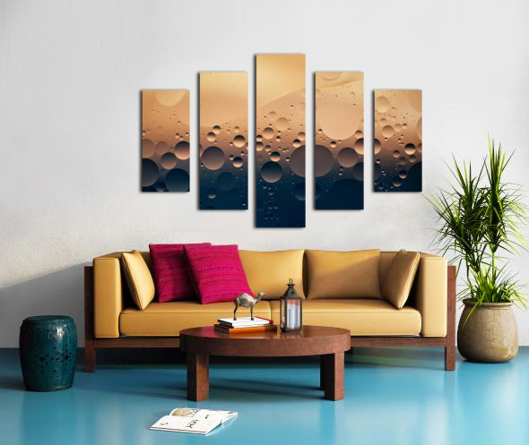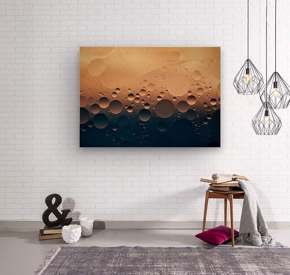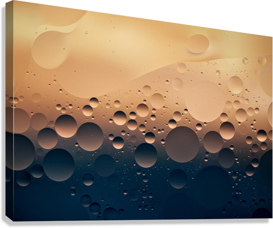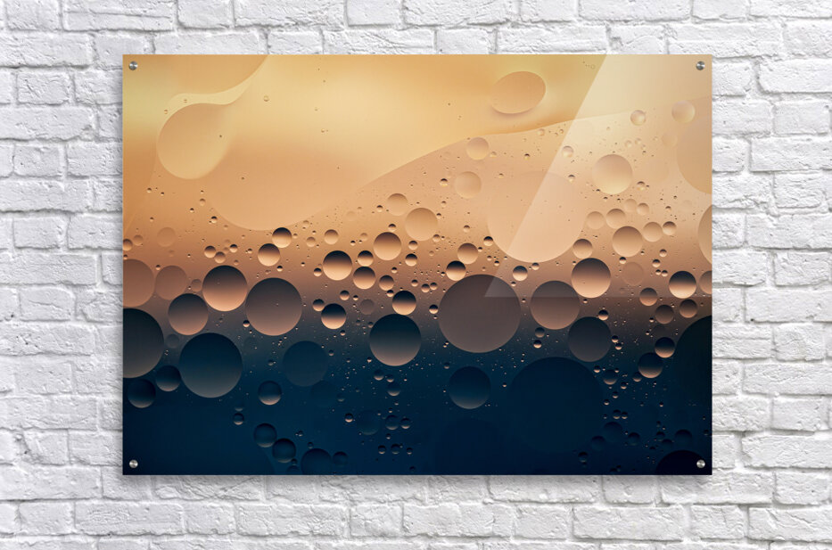 A macro photograph of oil droplets suspended on the surface of water highlighting the intricate patterns and smooth textures created by the interaction between liquid and light. The subtle details in this close-up offer a unique perspective on a simple yet captivating subject. A perfect photograph for those seeking abstract artwork that draws attention to the beauty of everyday materials.