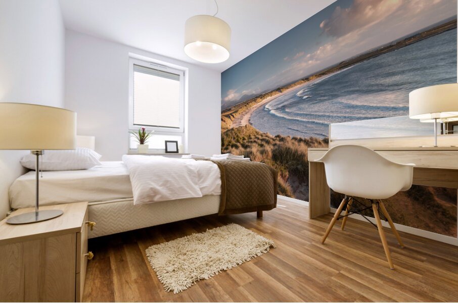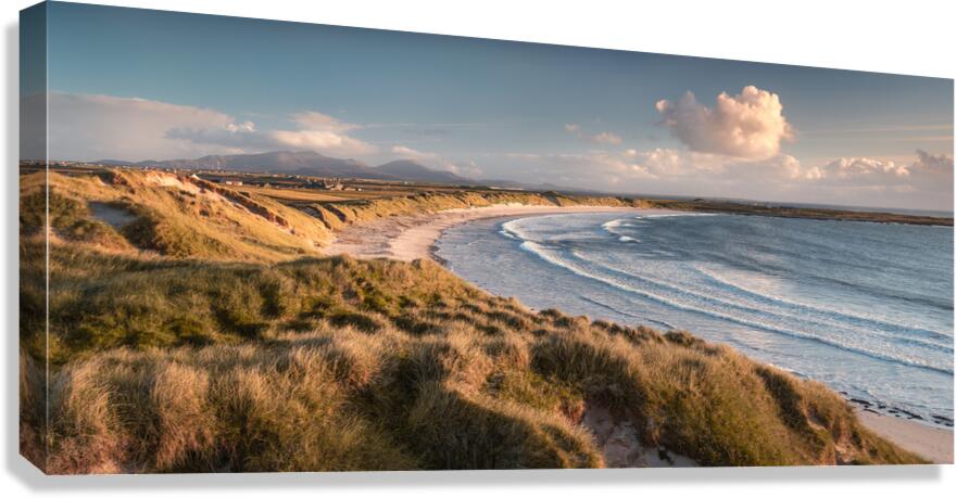 A panoramic view of a sandy beach on the Isle of Uist Outer Hebrides Scotland captured in soft evening light. The sunlight highlights the natural contours of the sand dunes creating a serene and peaceful scene in this remote coastal area. A great photograph for those seeking tranquil landscapes that reflect the beauty of Scotland’s untouched wilderness.