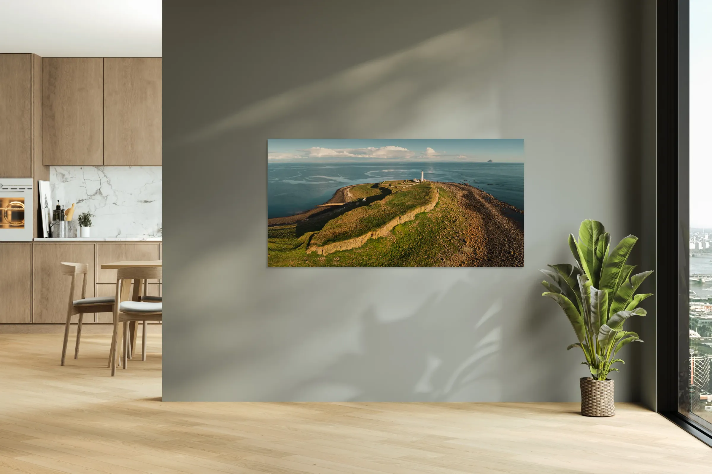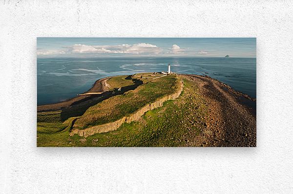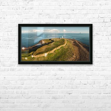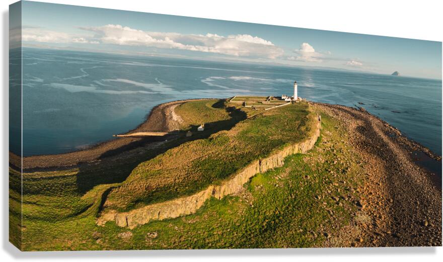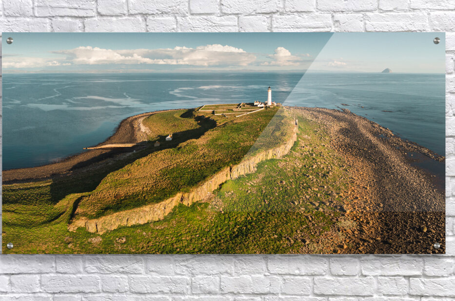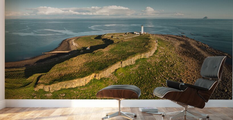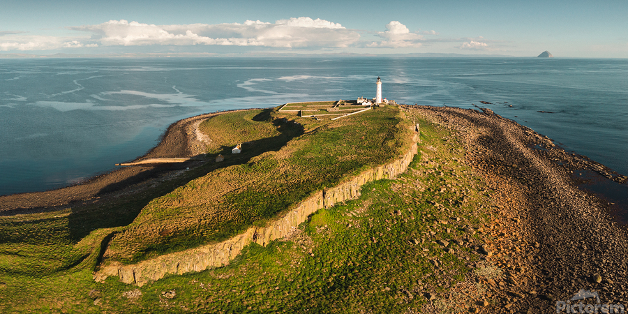 An aerial view of Pladda lighthouse on a clear sunny day with the distant Ailsa Craig island on the horizon. Pladda Island sits off the coast of the Isle of Arran Scotland surrounded by calm blue waters. The lighthouse and its rugged surroundings create a striking contrast against the open sea. A perfect photograph for those who appreciate coastal landscapes and Scottish maritime heritage ideal for collectors or anyone with a connection to the Isle of Arran or Scotlands iconic lighthouses.