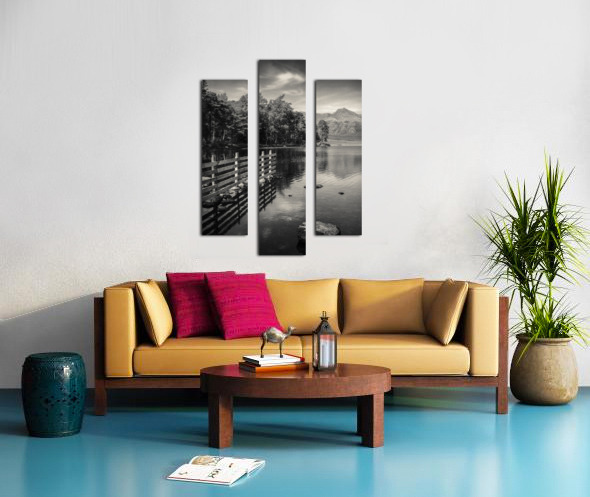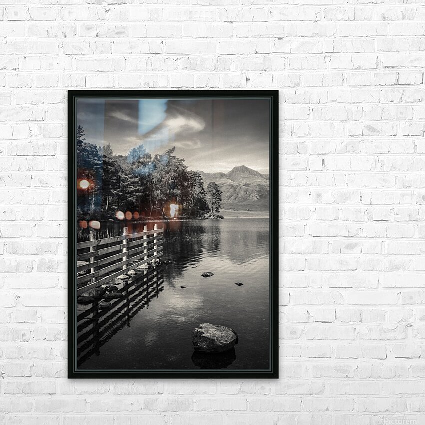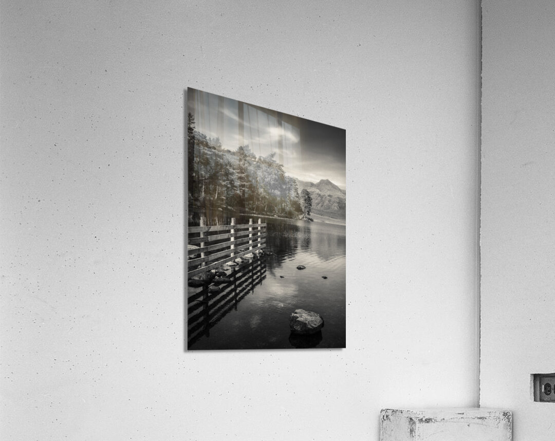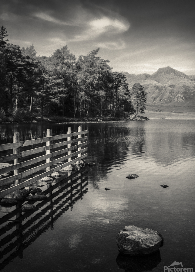 A monochrome photograph showcasing Blea Tarn in the Lake District National Park Cumbria. A wooden fence stretches into the water leading the eye towar...[+]