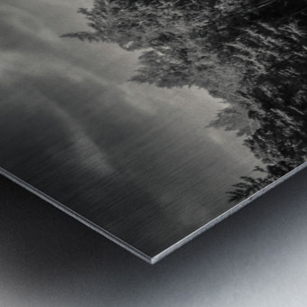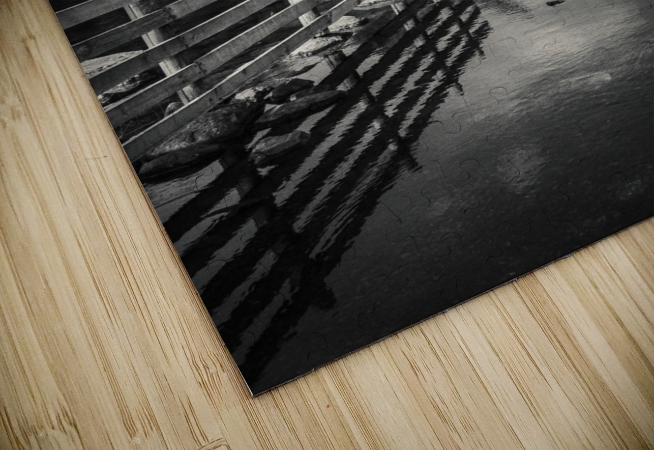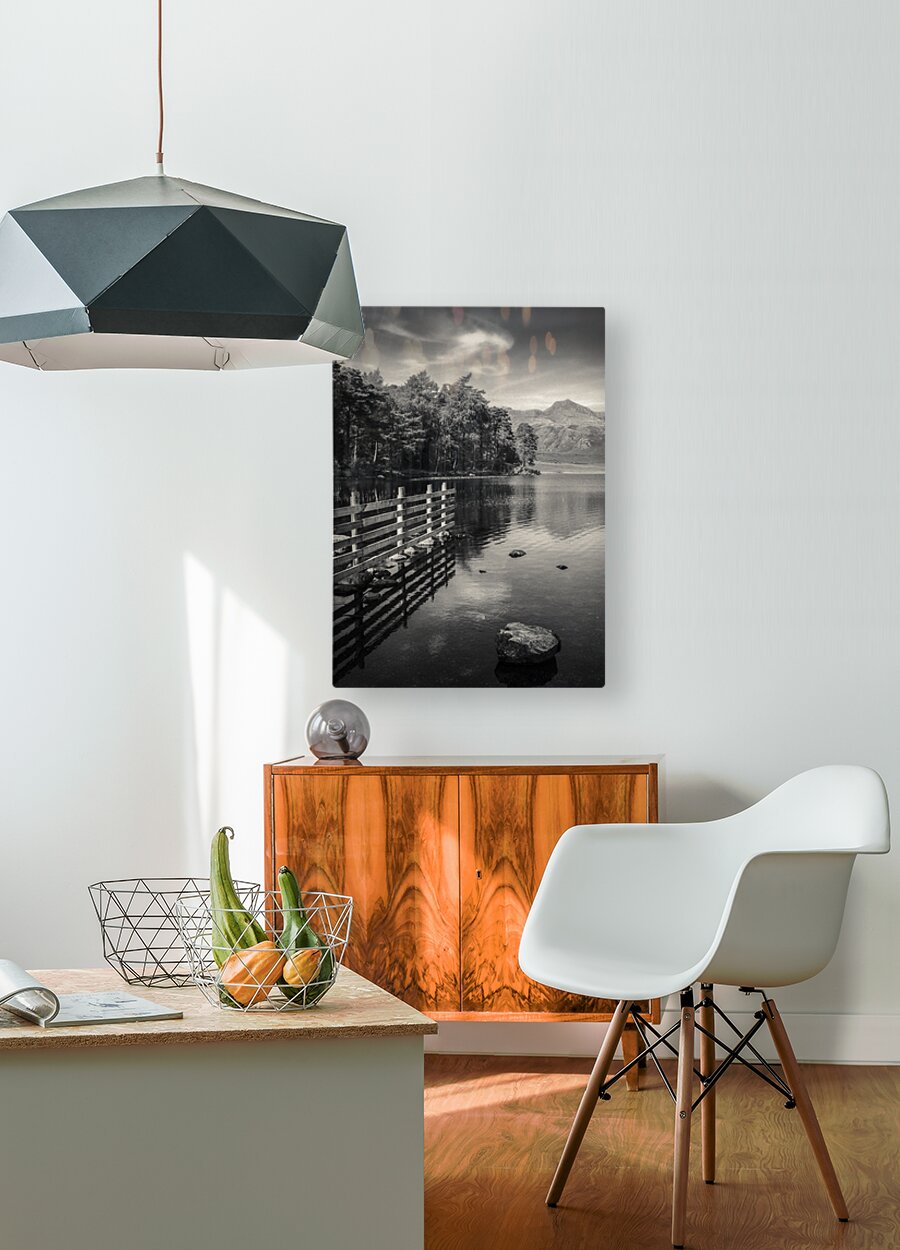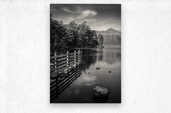 A monochrome photograph showcasing Blea Tarn in the Lake District National Park Cumbria. A wooden fence stretches into the water leading the eye toward the reflections of surrounding trees and distant mountains on the glassy surface of the lake. Wispy clouds hang in the sky adding depth and texture to the serene landscape. A perfect photograph for nature lovers landscape enthusiasts or anyone looking to bring a tranquil scenic view into their home or workspace. ...... Please note: This image has a slightly grainy texture because it was photographed on analog film.