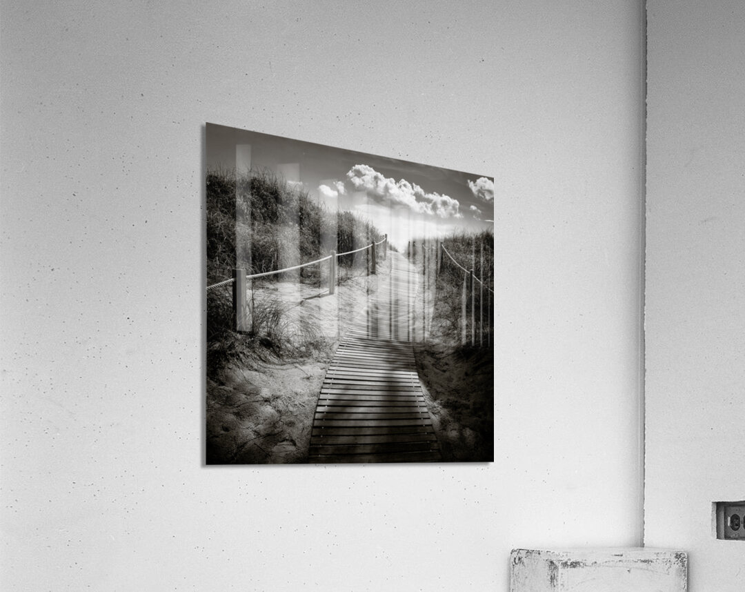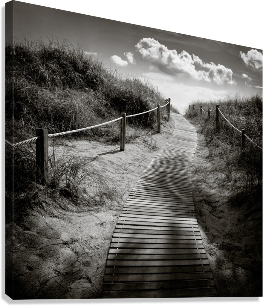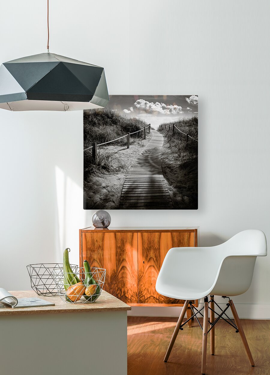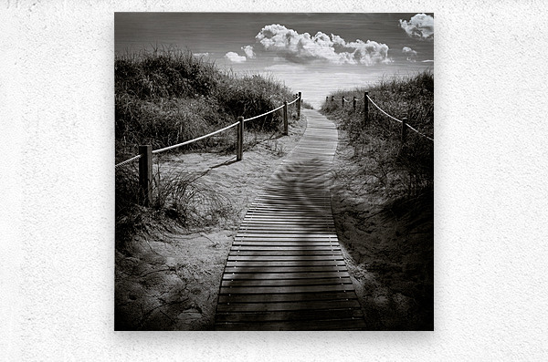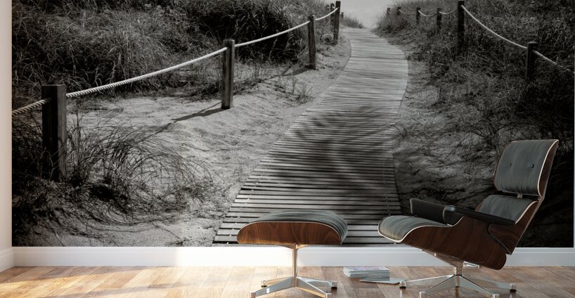 A monochrome photograph capturing the intricate shadows of palm trees on a wooden boardwalk leading to South Beach Miami USA. This image showcases the unique interplay of light and shadow highlighting the serene atmosphere of the coastal landscape. The ideal photograph for interior designers art collectors and those seeking to enhance their space with a touch of Miamis natural beauty.