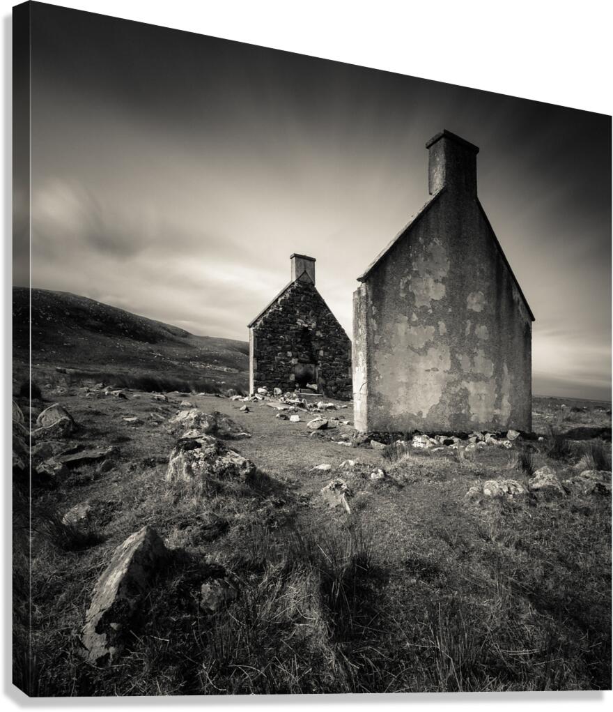 A monochrome photograph capturing the last remains of Slaggan a deserted village in Wester Ross Scotland UK. The image highlights the gable ends of a house built by the Mackenzie family in 1936 which burnt down in 19423 likely due to navy personnel seeking shelter. Slaggan once a small crofting settlement became abandoned after its young residents left to find work leaving only the Mackenzies until the village was finally deserted. A great photograph for history enthusiasts those interested in abandoned places or anyone with a connection to Scotlands rural past.