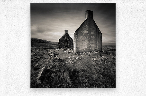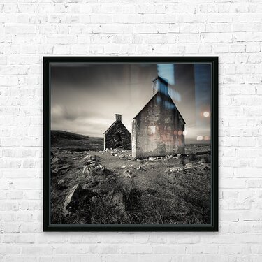 A monochrome photograph capturing the last remains of Slaggan a deserted village in Wester Ross Scotland UK. The image highlights the gable ends of a ...[+]