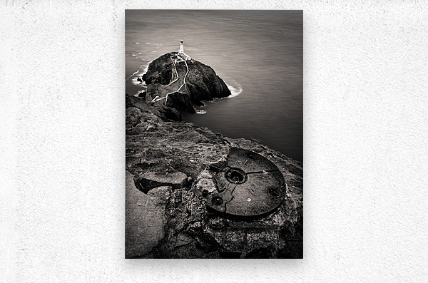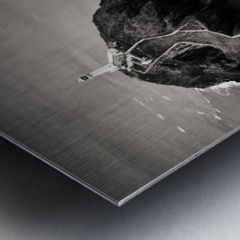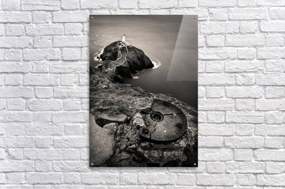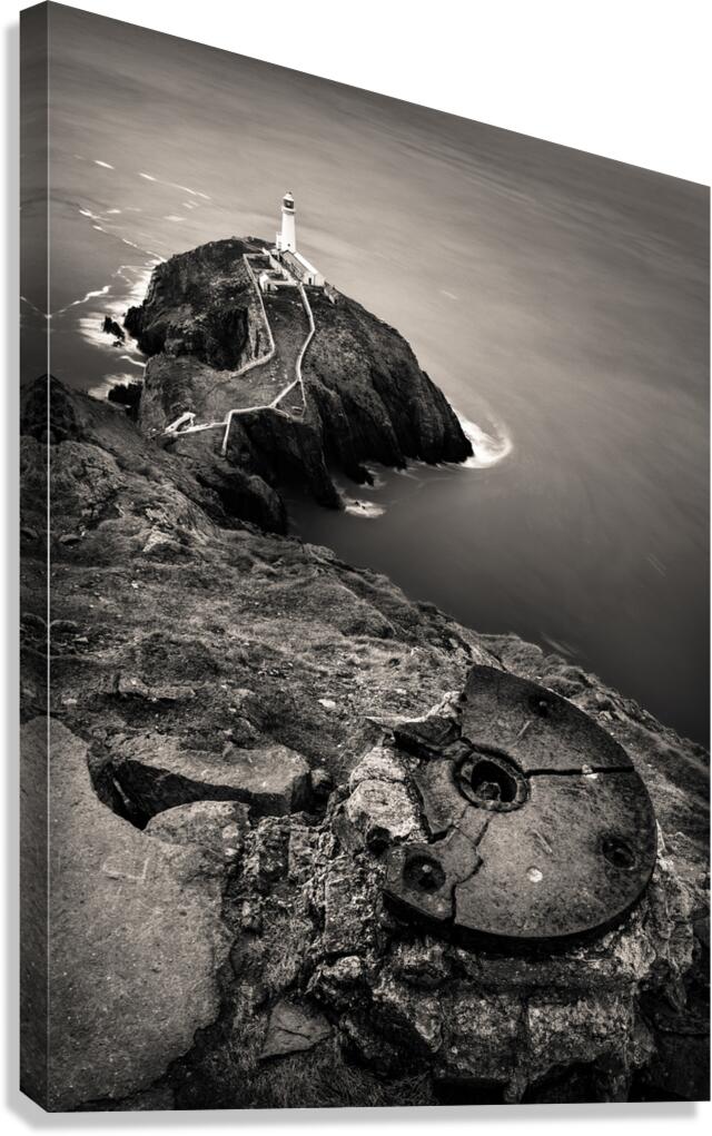 A monochrome photograph capturing a dramatic aerial view of South Stack Lighthouse perched on the rugged coastline of the Isle of Anglesey North Wales. The image highlights the lighthouses remote location surrounded by the vast stormy sea and steep cliffs. A perfect photograph for those who appreciate coastal landscapes lighthouse enthusiasts or anyone seeking a bold and moody piece of wall art.