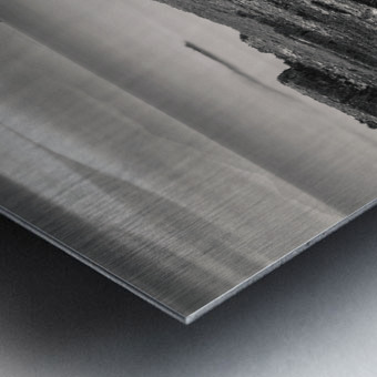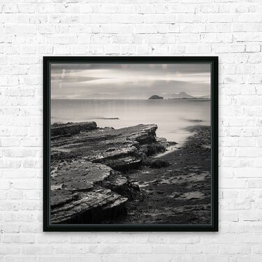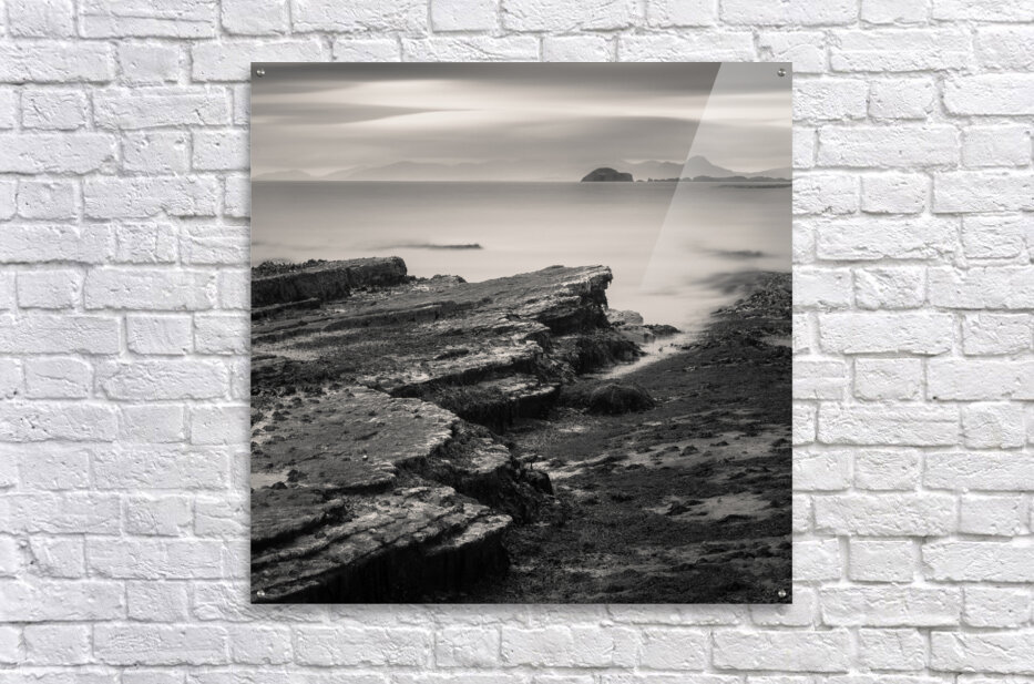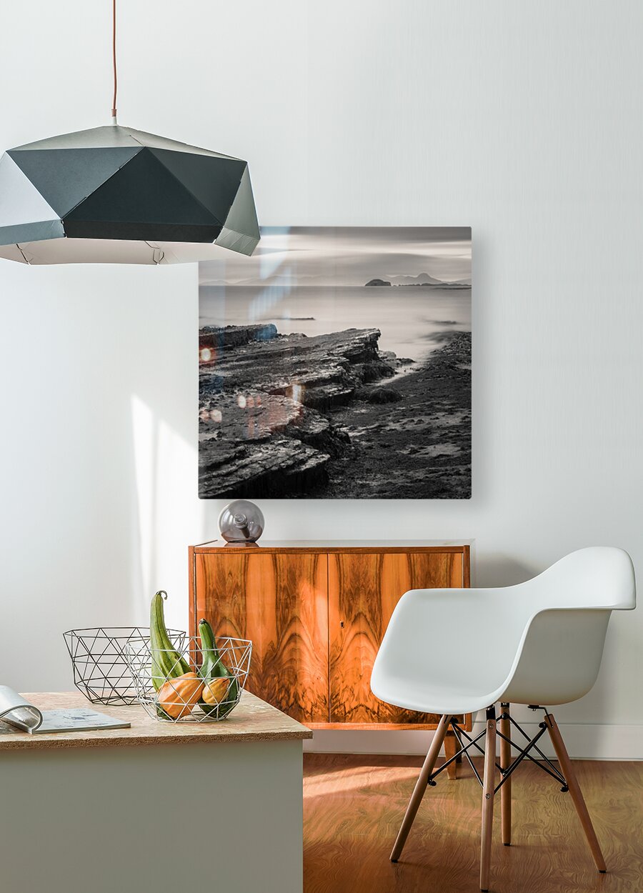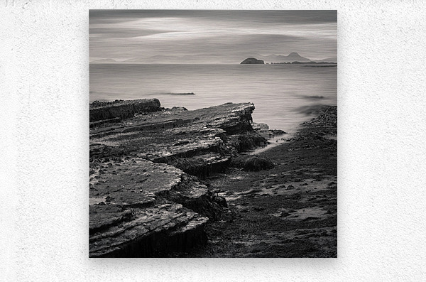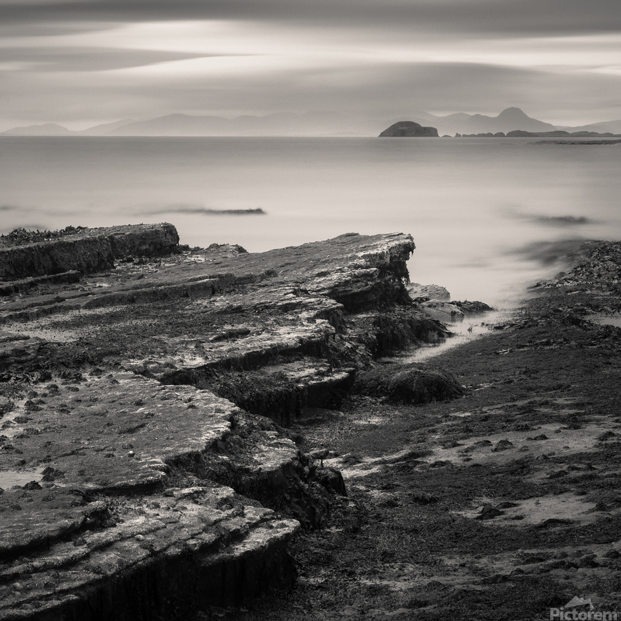 A monochrome long exposure photograph of the Isle of Skye coastline in the Inner Hebrides Scotland. The image captures rugged coastal rocks smooth sea waters and distant mountains partially hidden by low clouds. A great photograph for lovers of seascapes minimalist art or those looking to bring the dramatic beauty of Scotland into their home or office.