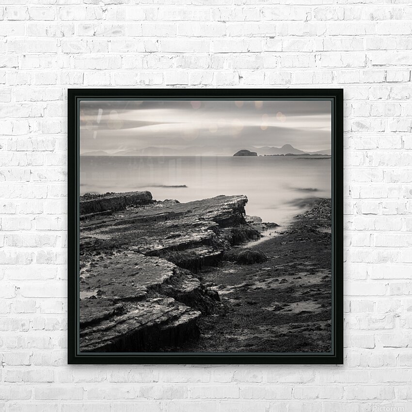 A monochrome long exposure photograph of the Isle of Skye coastline in the Inner Hebrides Scotland. The image captures rugged coastal rocks smooth sea...[+]