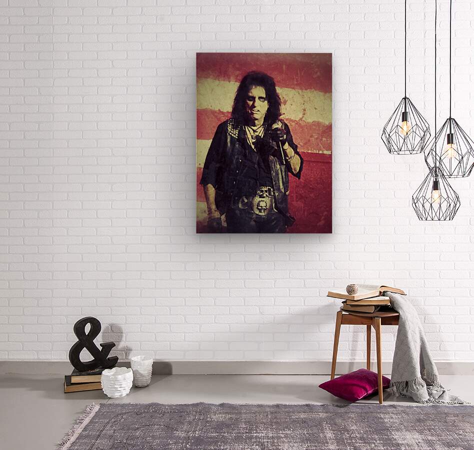 A stylized photograph of Alice Cooper performing on stage at Glasgows SSE Hydro in November 2017 with the bold red and white stripes of the American flag as a dramatic backdrop. This image captures the energy of the live performance. A great photograph for rock music fans collectors of concert photography or those seeking unique images of Alice Cooper. ..... Please note: This image has a grain and texture which is intentional and part of the image aesthetic.