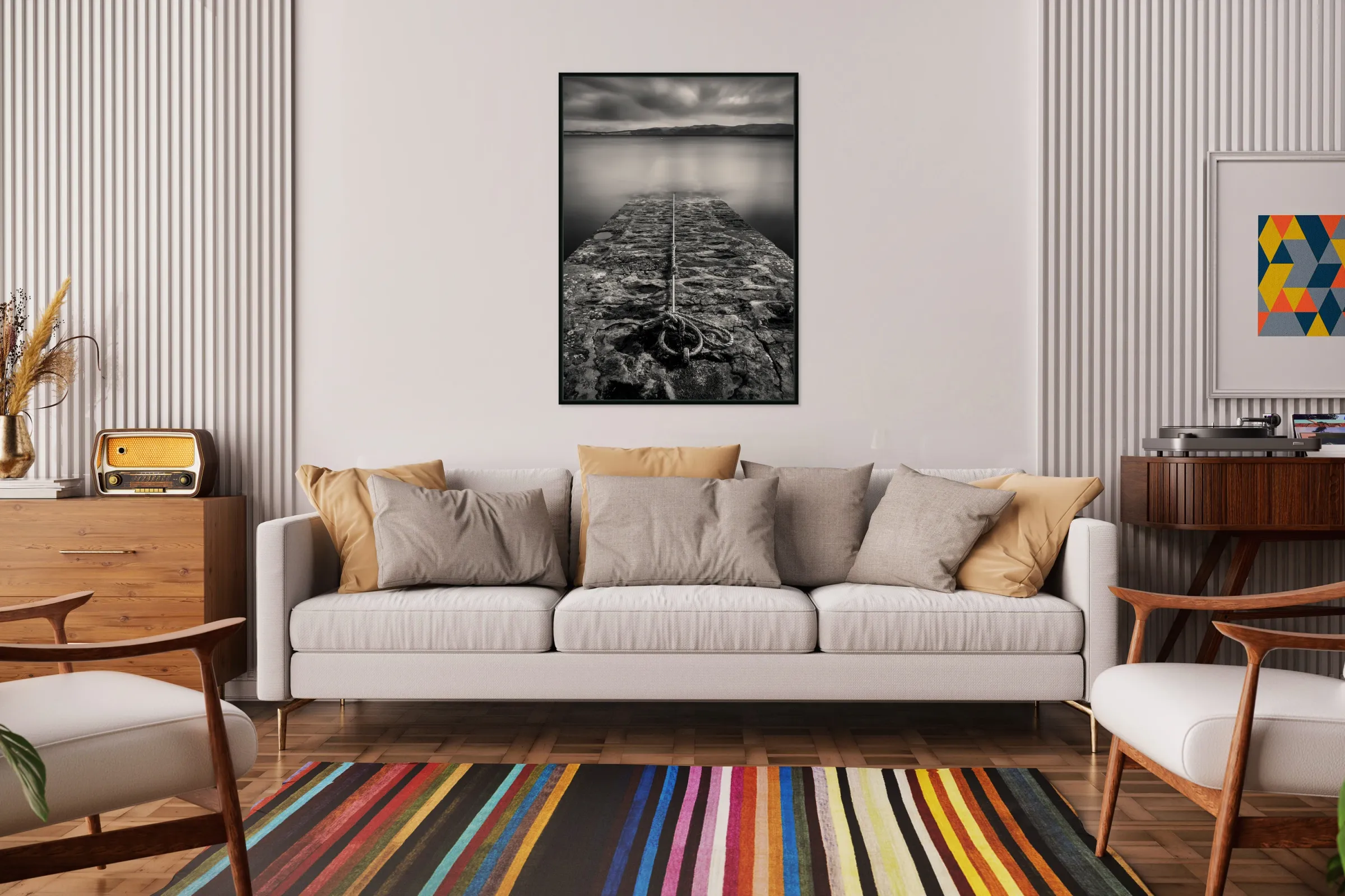 A monochrome long exposure photograph of a mooring ring and rope stretching into Loch Ewe taken from a stone launching ramp near Midtown in the Scottish Highlands. The calm water contrasts with the textured foreground creating a striking coastal scene. A great photograph for those seeking minimalist and atmospheric seascapes or nautical-themed artwork.
