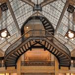 A view looking up at the Light Court Grand Staircase in the Rookery Building Chicago showcasing the intricate roof design and the two lower sections o...[+]