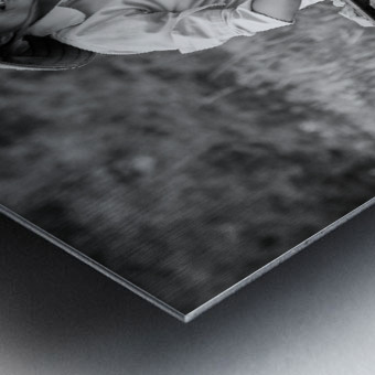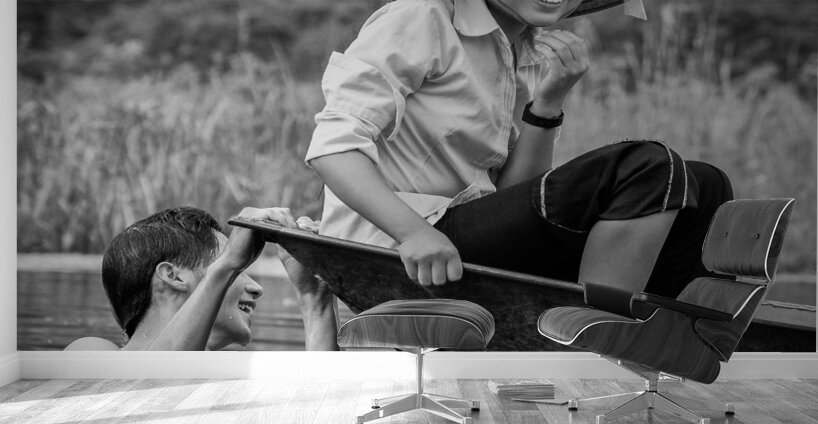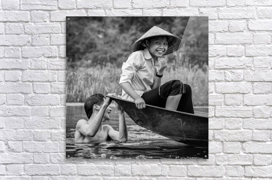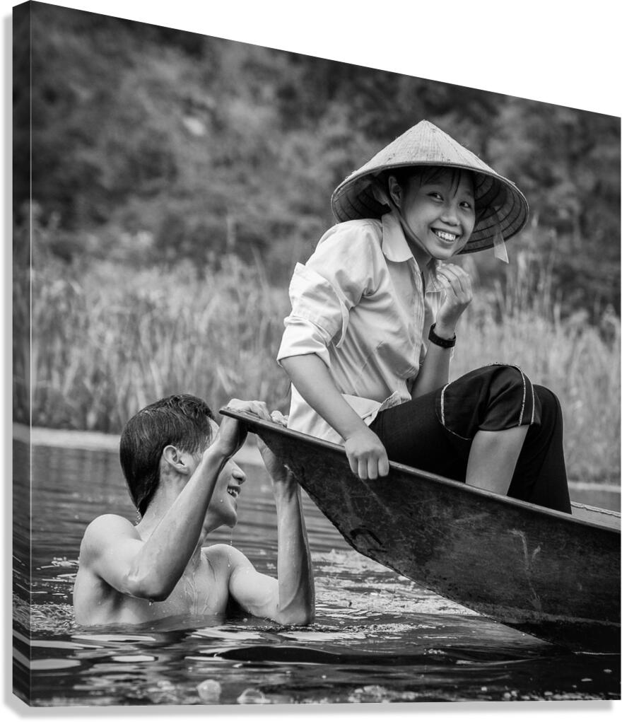 A monochrome photograph capturing a young Vietnamese couple enjoying a playful moment on the Yen River in Vietnam 2006. The image features a smiling girl wearing a traditional nón lá conical hat as she sits in the boat while a young man pushes the boat from behind in the water. This scene highlights the joy and simplicity of life along the river. A great photograph for those seeking to add cultural charm and warmth to their collection
