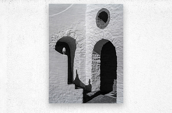 A monochrome photograph of the distinctive architecture within the Italianate village of Portmeirion Gwynedd North Wales. It highlights the arched entranceways round windows and steps that are part of the unique charm the village is renowned for. This iconic setting was also featured in the classic TV series The Prisoner starring Patrick McGoohan. A great photograph for fans of architectural history and classic television alike.