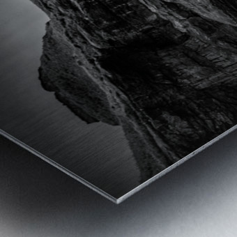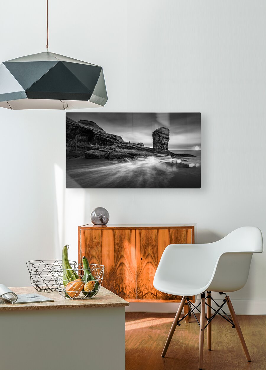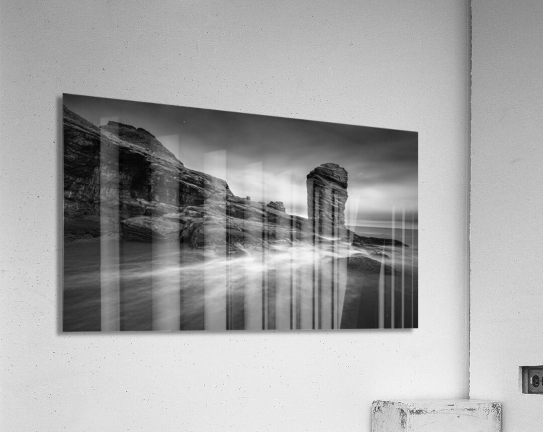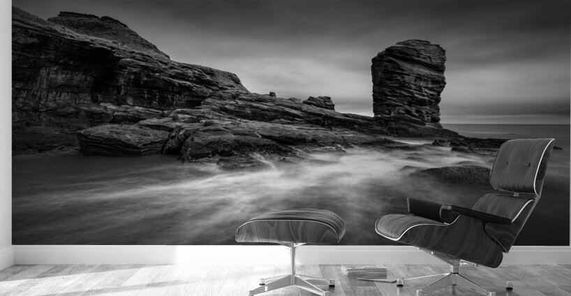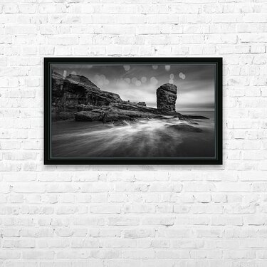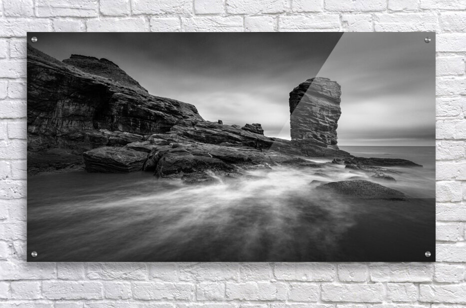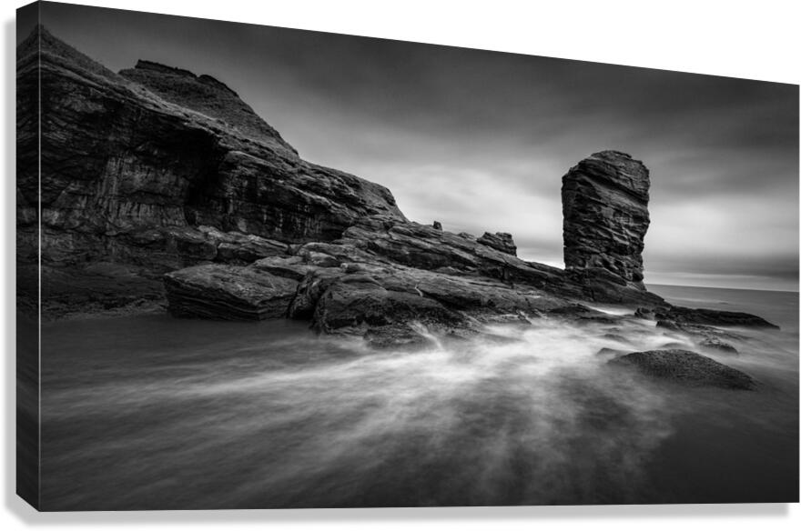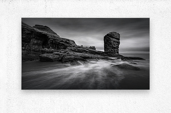 A monochrome photograph of The Devils Head a distinctive sandstone sea stack that rises dramatically along the cliffs near Arbroath on Scotlands east coast. The striking rock formation contrasts against the rugged landscape creating a bold and timeless image that captures the essence of the Scottish coastline. A perfect photograph for lovers of coastal scenery and those drawn to Scotlands natural landmarks.