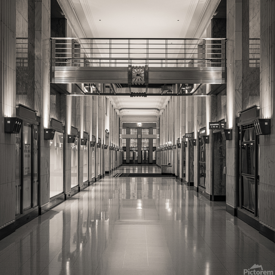 A monochrome photograph capturing the striking Art Deco interior of the Field Building in Chicago. The image looks down an empty corridor towards the ...[+]