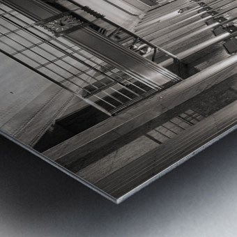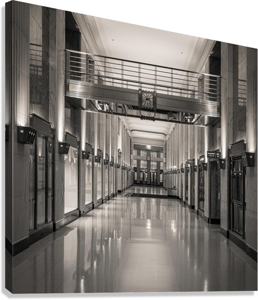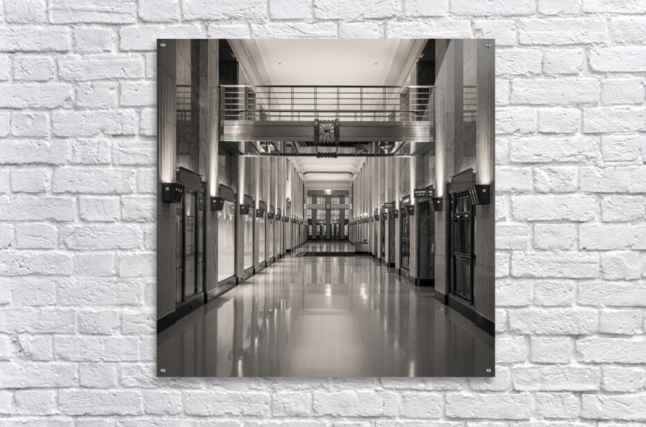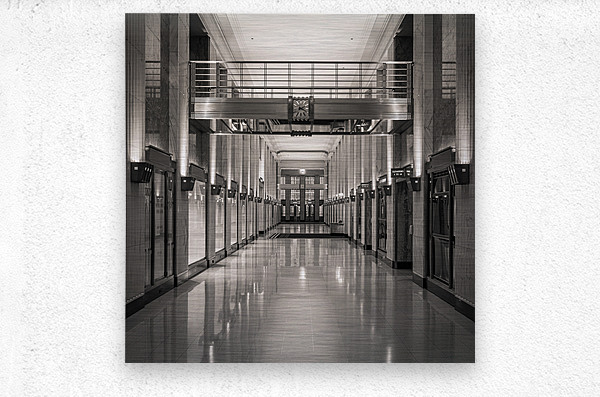 A monochrome photograph capturing the striking Art Deco interior of the Field Building in Chicago. The image looks down an empty corridor towards the LaSalle Street entrance showcasing the building’s sleek geometric lines and decorative details typical of the 1930s architectural style. A perfect photograph for architecture enthusiasts or those interested in iconic urban design and famous Chicago landmarks.