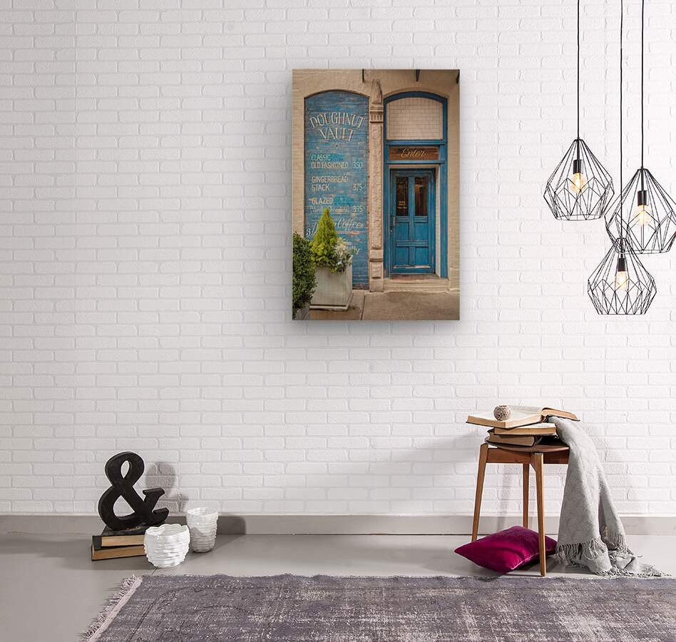 A photograph capturing the exterior of a rustic donut shop with a weathered blue door and a vintage sign mounted on a painted brick wall. Set in the back streets of Chicago this image reflects the character of an urban hidden gem. A perfect photograph for anyone seeking authentic cityscapes or nostalgic storefronts.