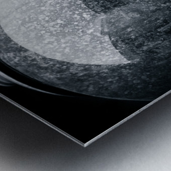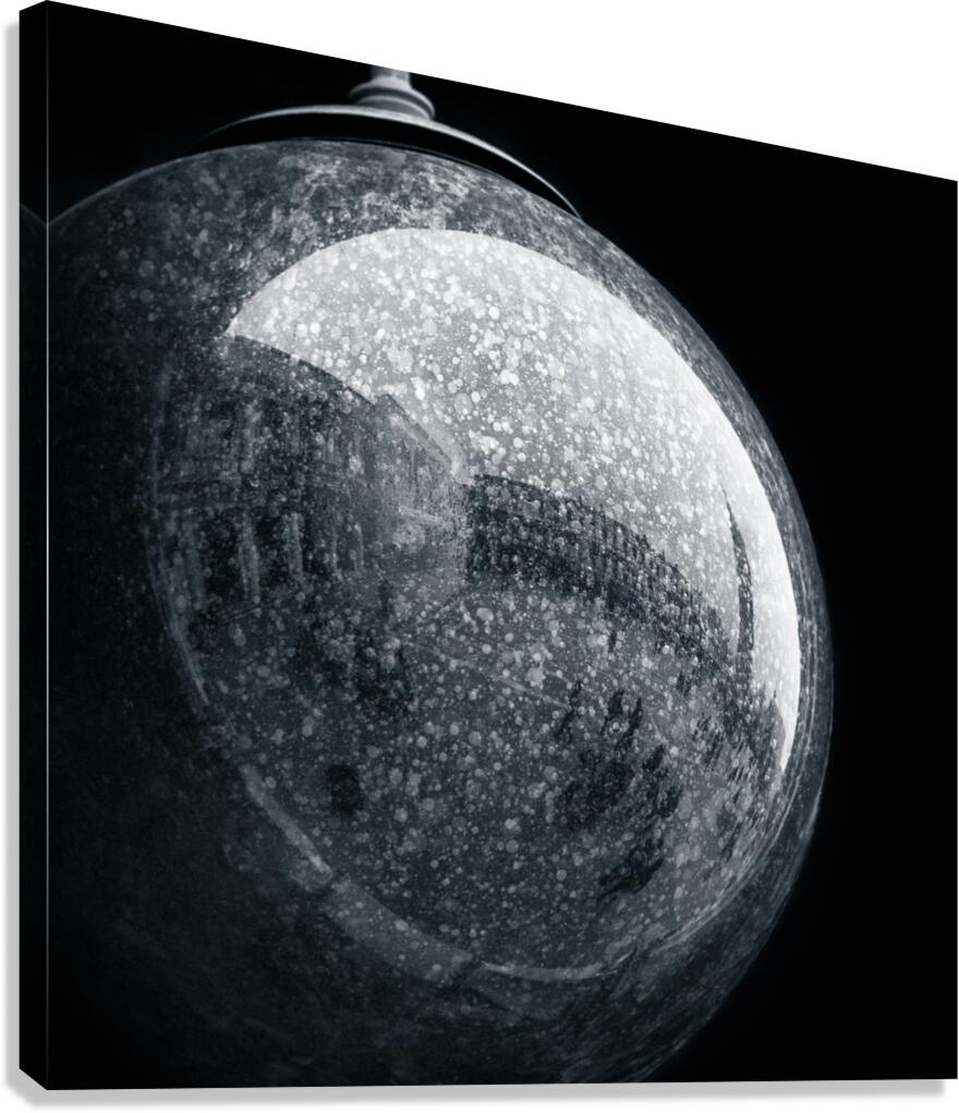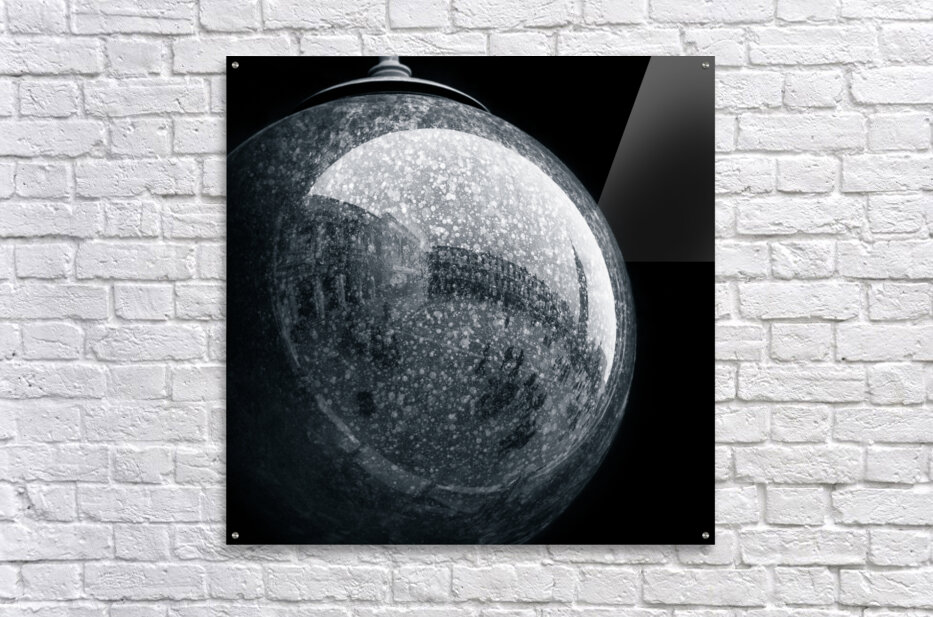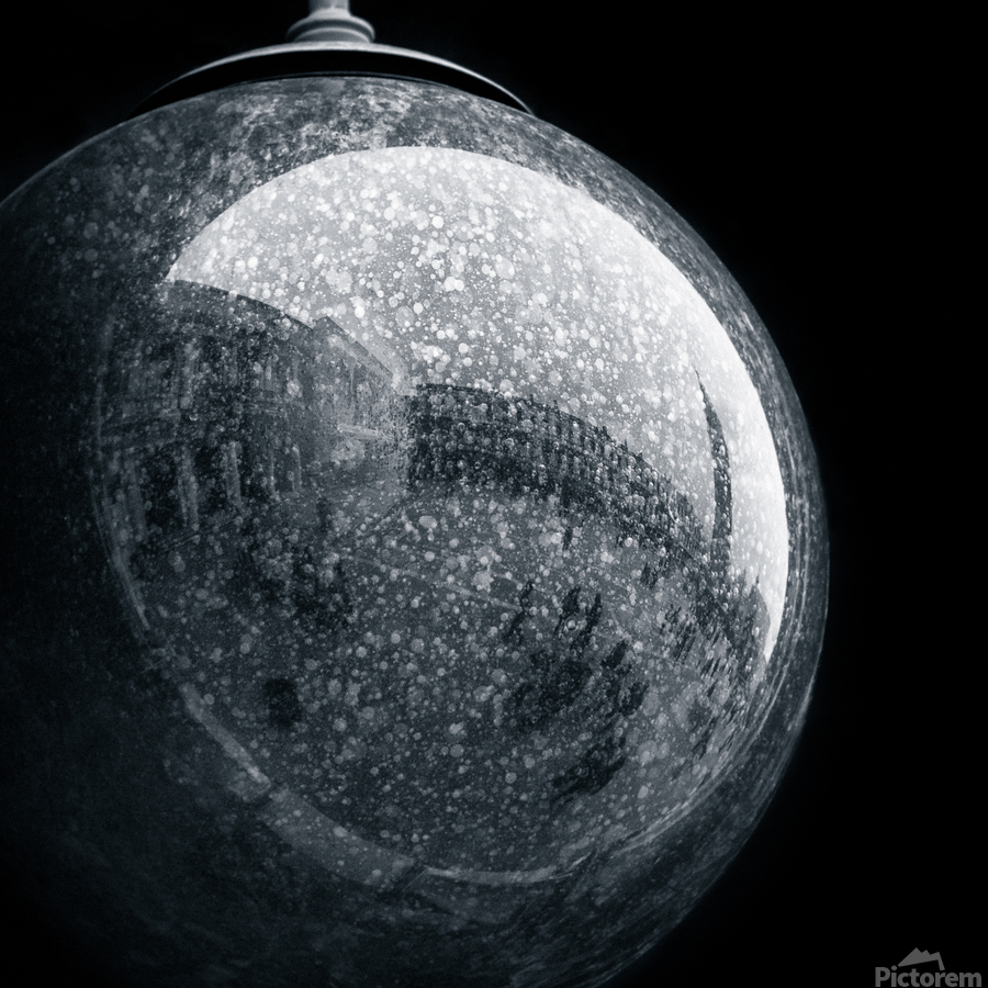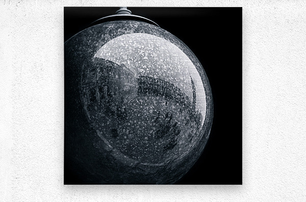 A monochrome close-up photograph of a glass orb lamp outside a street-side café in Piazza San Marco Venice Italy. The reflection reveals the outline...[+]
