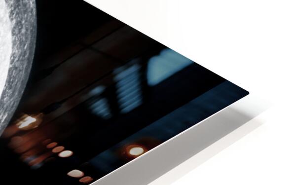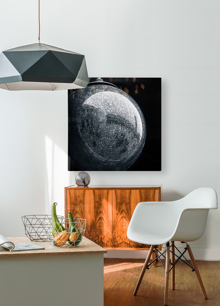 A monochrome close-up photograph of a glass orb lamp outside a street-side café in Piazza San Marco Venice Italy. The reflection reveals the outline of San Marco Square and the silhouettes of people within it. This image captures a moment of quiet elegance focusing on the interplay of light and form and inviting contemplation of the scene. A great photograph for art enthusiasts and collectors looking to evoke a sense of place.