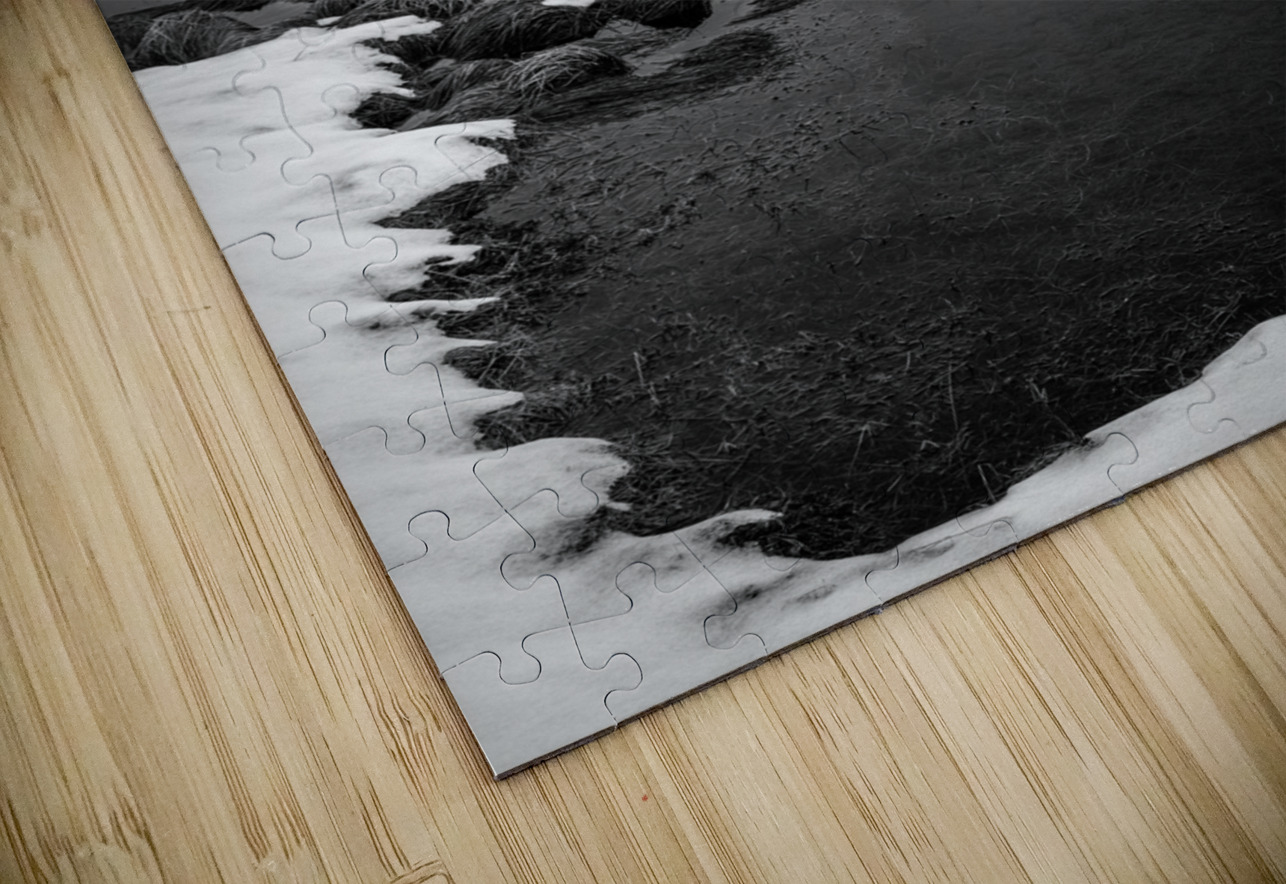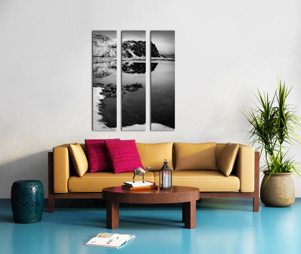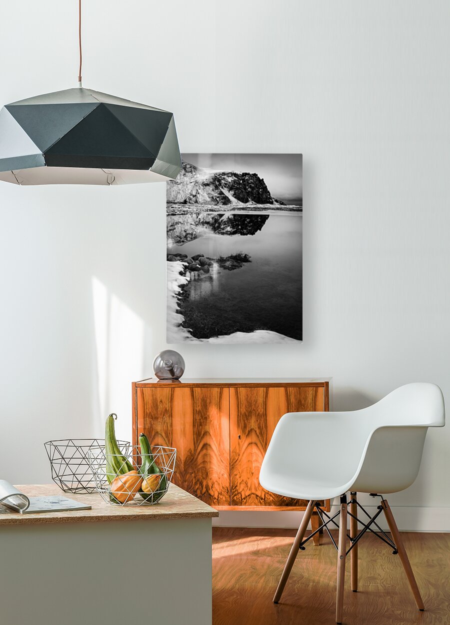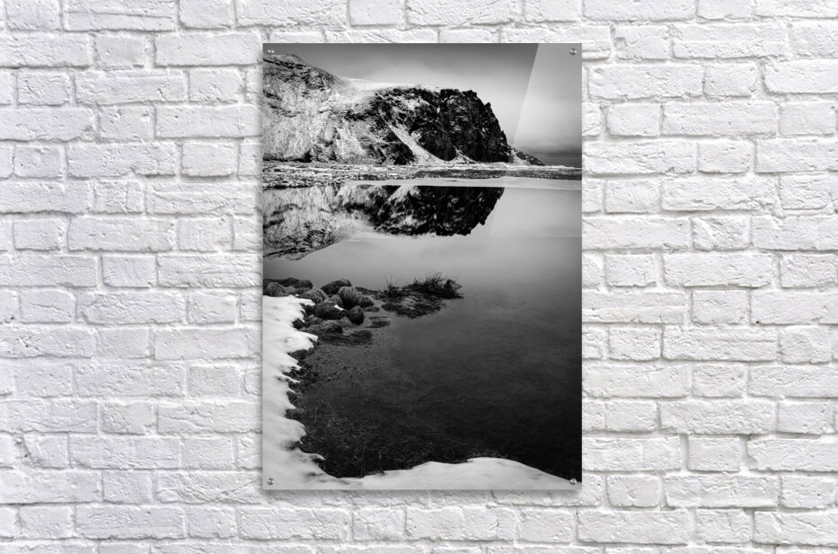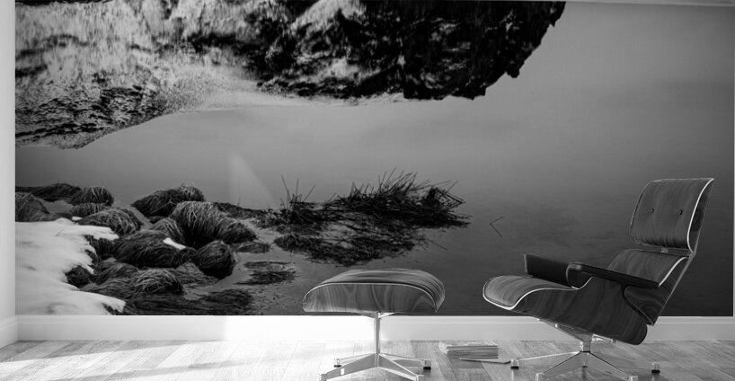 A monochrome photograph capturing the reflection of Stora Dimon mountain in a still icy pool in Iceland. The contrast between the rugged mountain peak and the reflective surface of the frozen water adds depth and tranquility to the scene. A great photograph for lovers of minimalist landscapes and monochrome art.