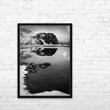 A monochrome photograph capturing the reflection of Stora Dimon mountain in a still icy pool in Iceland. The contrast between the rugged mountain peak...[+]