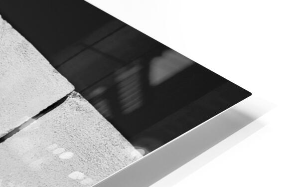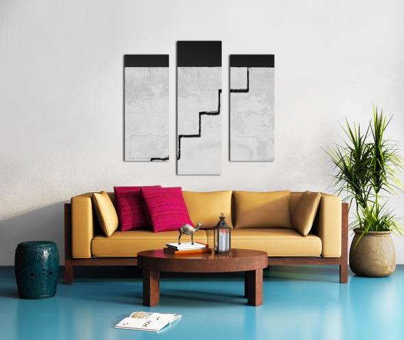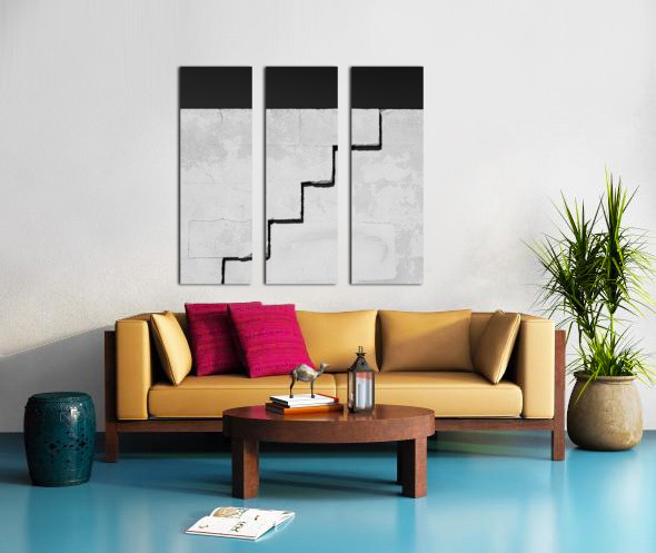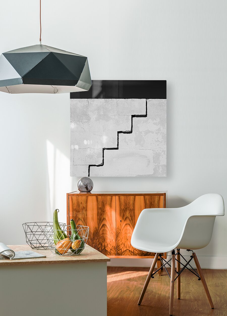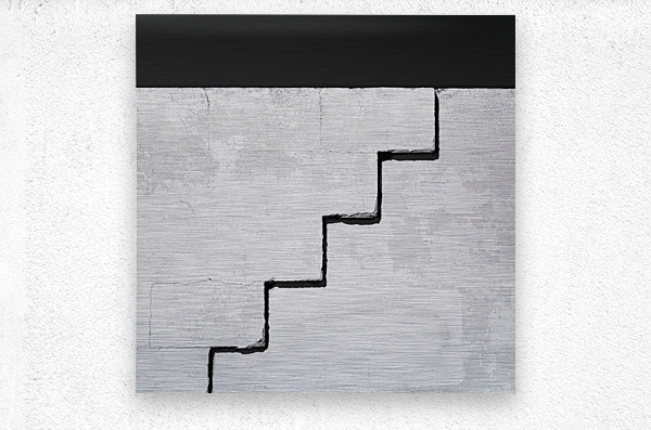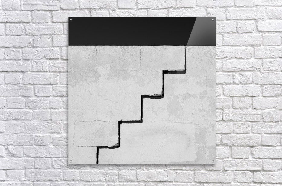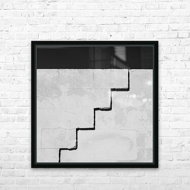 A monochrome minimalist photograph of a white concrete wall marked by a striking black crack its jagged line forming a stair-like pattern across the smooth plaster surface. A perfect photograph for fans of abstract art or collectors drawn to minimalist textures and contrasts.
