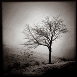 A monochrome photograph of a bare winter tree after a snow flurry, set against the remote landscape of Glen Etive in the Scottish Highlands. The image...[+]