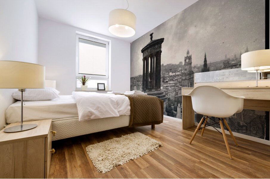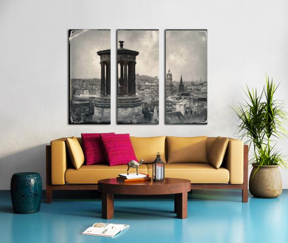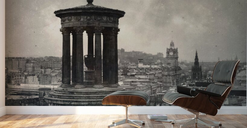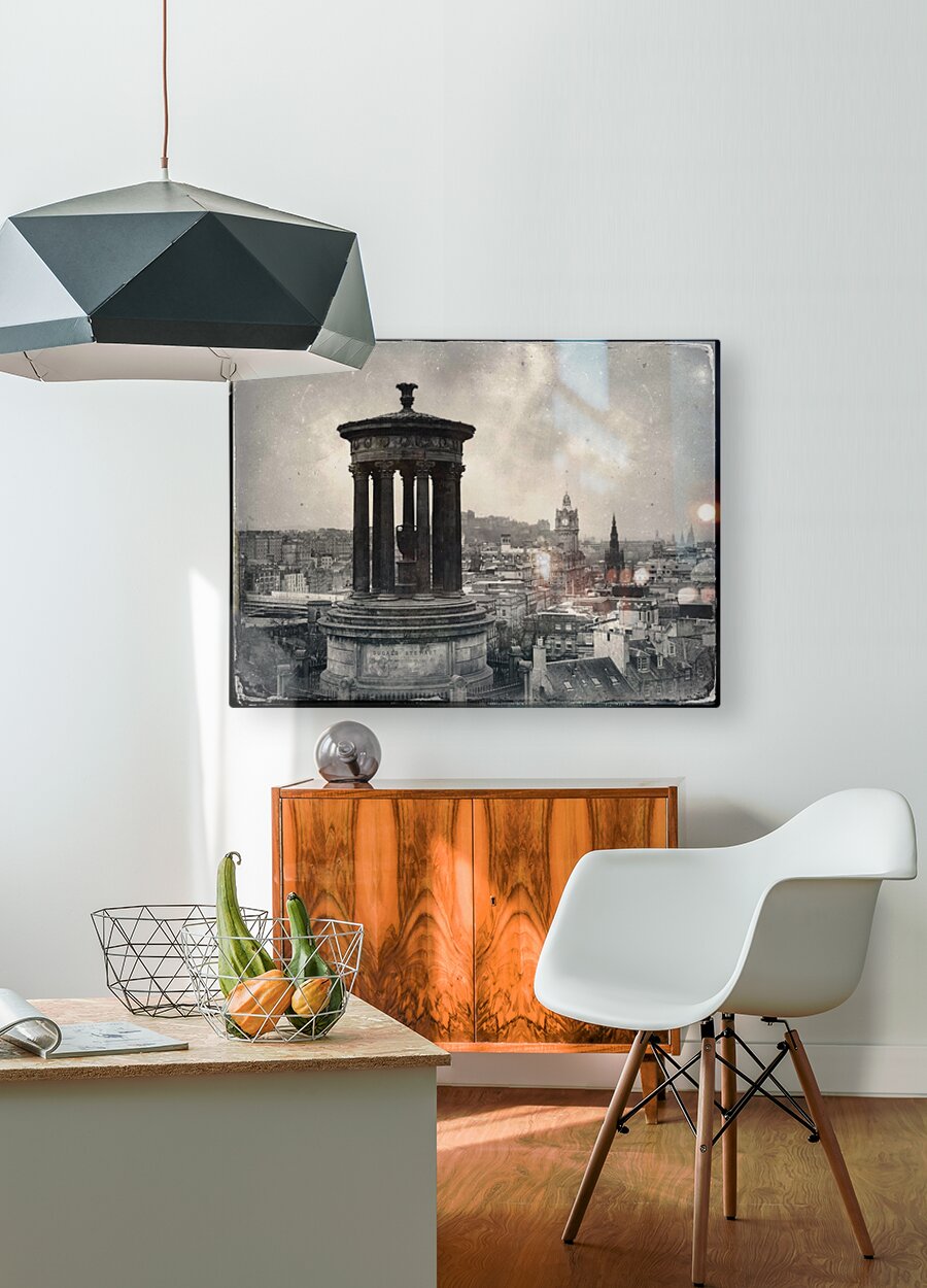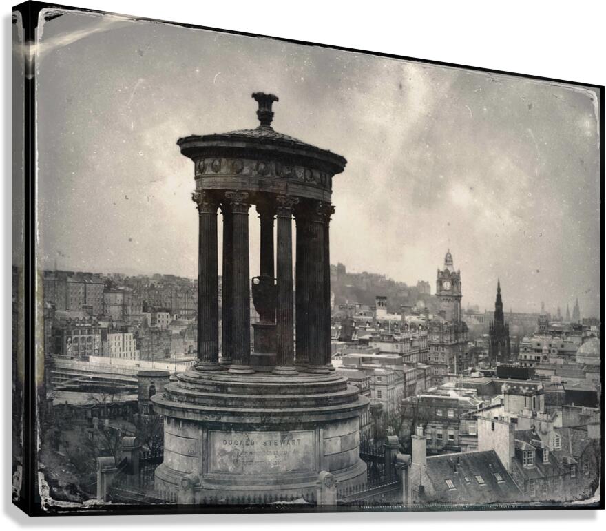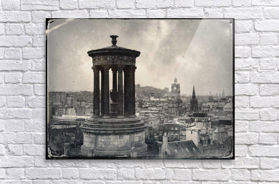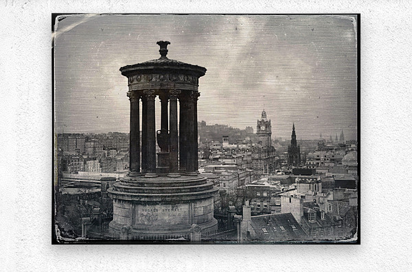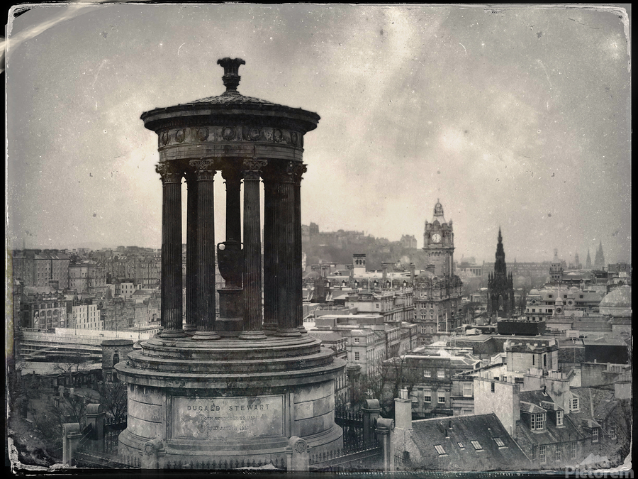 A monochrome view of Edinburgh city centre from Calton Hill features the iconic Dugald Stewart Monument prominently in the foreground. This tin-type s...[+]