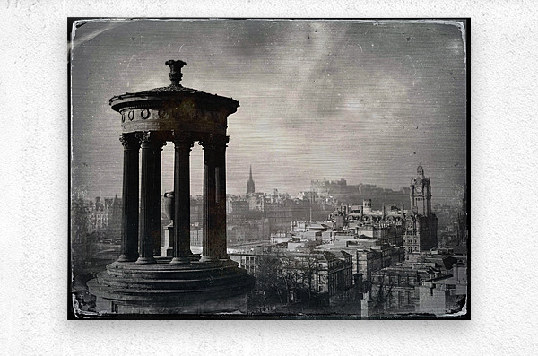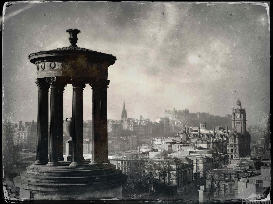 A monochrome view of Edinburgh city centre captured from Calton Hill featuring the iconic Dugald Stewart Monument in the foreground and Edinburgh Castle in the distance. This tin-type style photograph showcases the architectural details and historical significance of the city offering a timeless perspective of Edinburghs landscape. A perfect photograph for history enthusiasts and lovers of classic cityscapes. ..... Please Note: This image is intentionally presented with a grainy texture as part of its aesthetic.