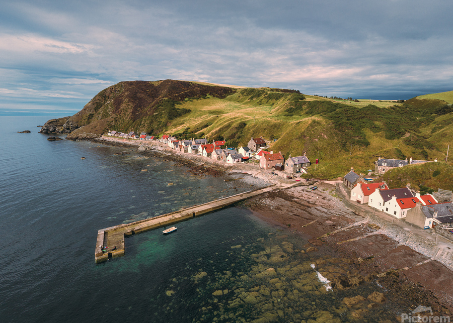 A serene aerial view of Crovie village on a summers evening located in Aberdeenshire Scotland. The photograph captures the tranquil charm of the villa...[+]